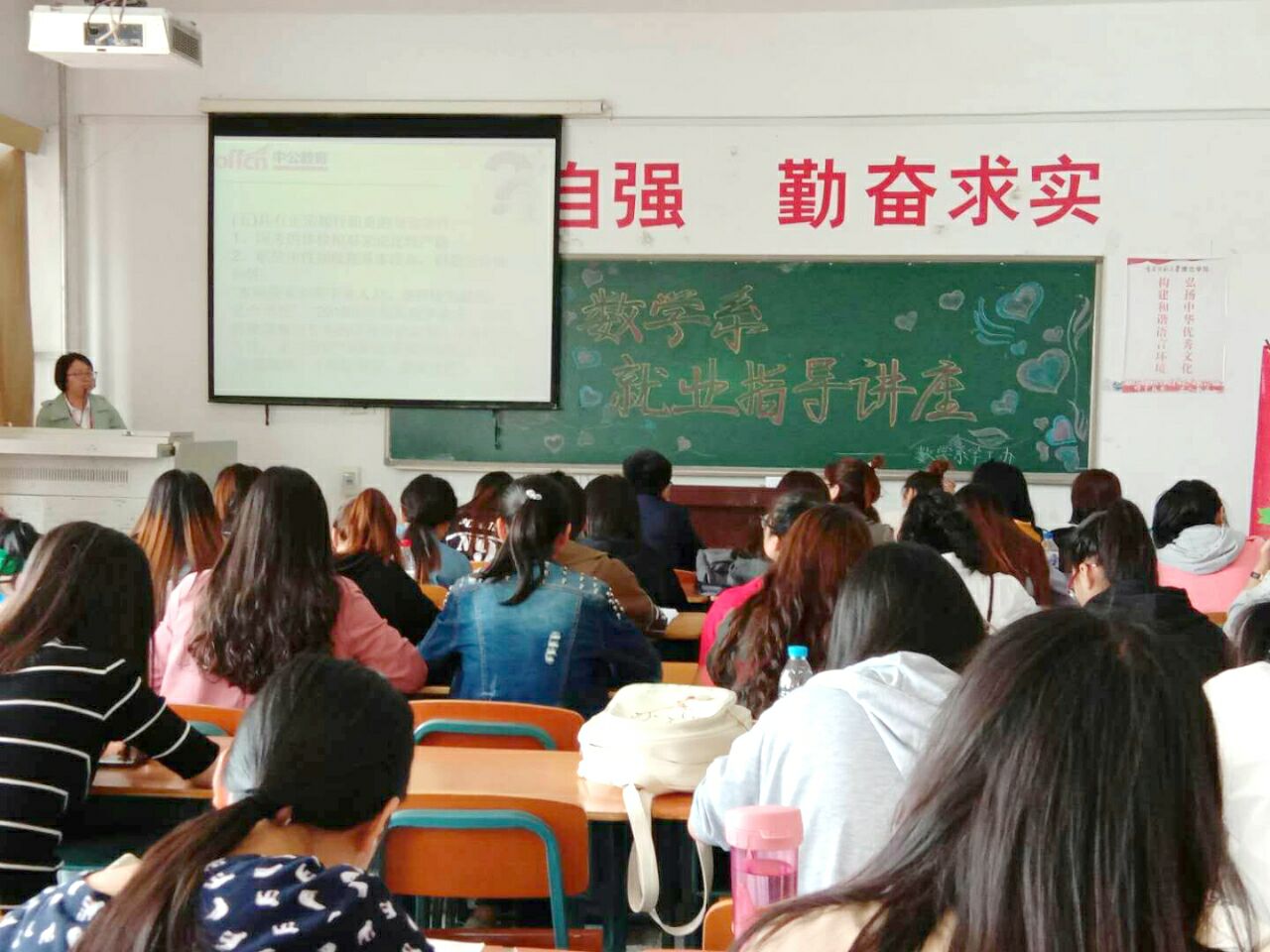 为了进一步帮助学生解决就业问题,了解所学专业的就业方向及就业前景 ,我系于2018年5月11日14:00,在1518教室开展了“数学系就业指导讲座”,特邀中公教育耿艳艳讲师,为我系学生讲解有关就业一系列问题,出席本次会议的有:学工办主任常秀云老师及2015级同学。