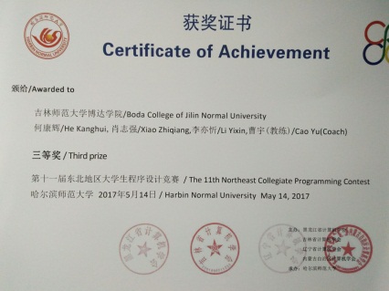 经过激烈角逐,本次大赛中,我院计算机与信息科学系的指导教练曹宇老师带领队员何康辉、肖志强、李亦忻,组成队伍“皮皮虾今天累了,不想走了”荣获三等奖,为学院争得荣誉。