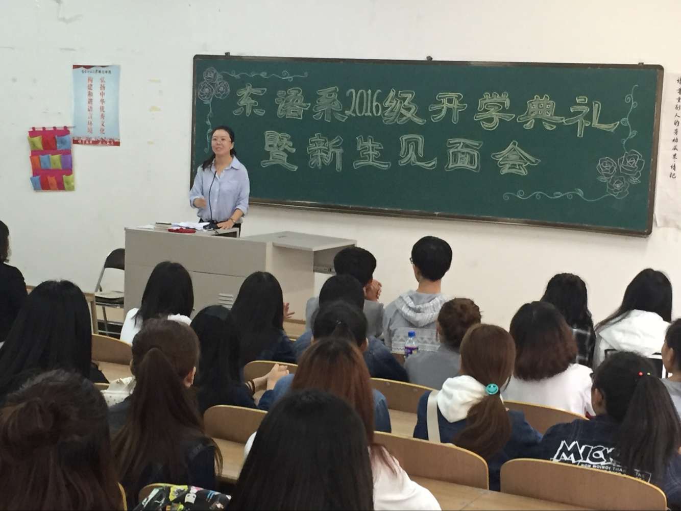 9月11日上午8时,东语系2016级学生开学典礼在3220教室隆重举行。副主任赵岩,学工办主任崔婷婷,秘书王鹤、夏俊杰,以及教师代表金锦姬、陈宇、马建,学生干部代表,49名新生出席了开学典礼。典礼由学工办主任崔婷婷主持。