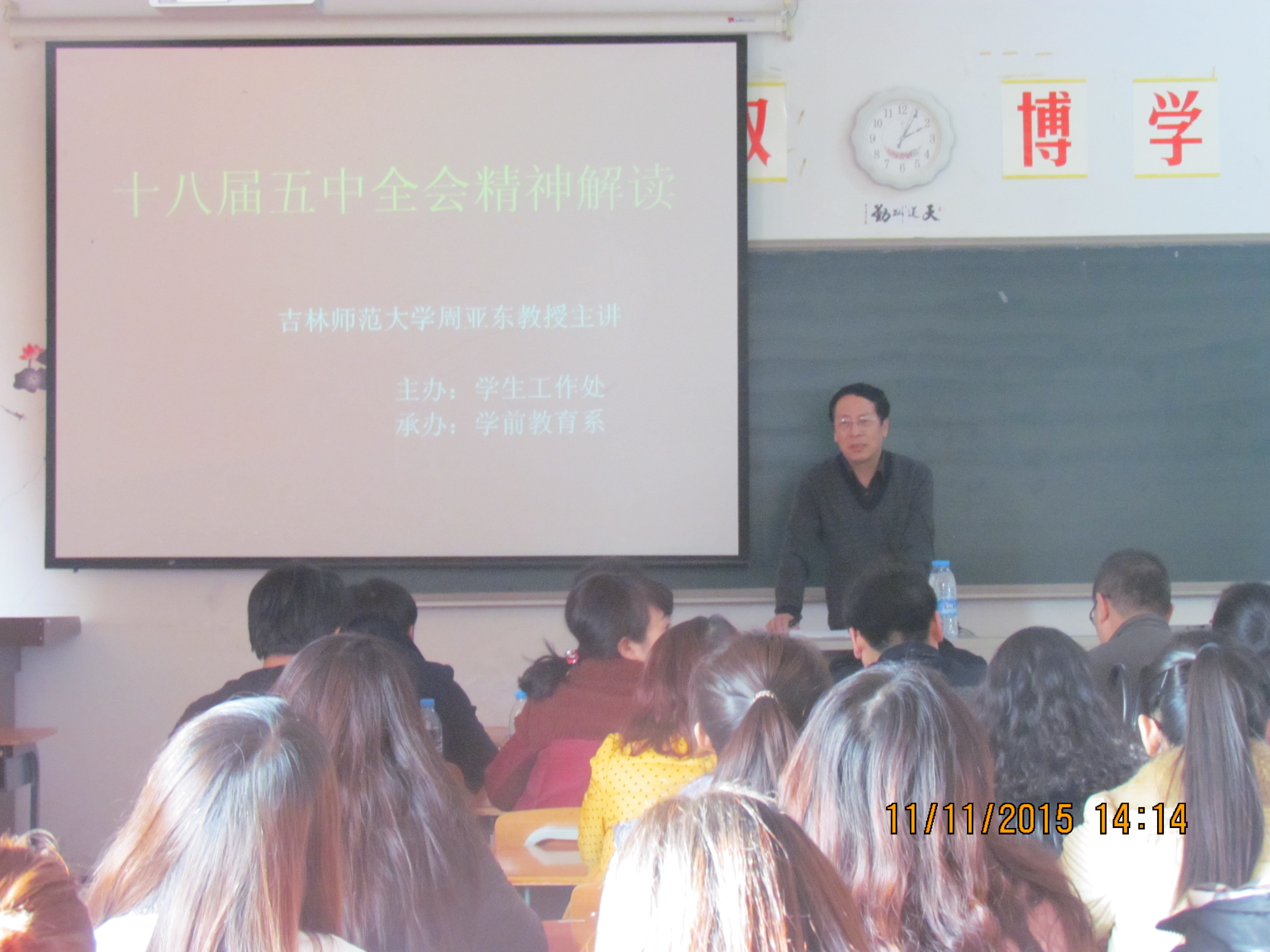 为切实增强我院学生工作队伍对十八届五中全会精神的认识和理解,结合我院2015—2016学年辅导员队伍培训计划,11月11日下午,由我院学生处主办,学前教育系承办,特邀吉林师范大学政法学院周亚东教授主讲,举办关于《全面建设小康社会的纲领性文献—十八届五中全会精神解读》专题报告会。学生工作处、团委、全体辅导员老师以及学生干部骨干参加了此次报告会。