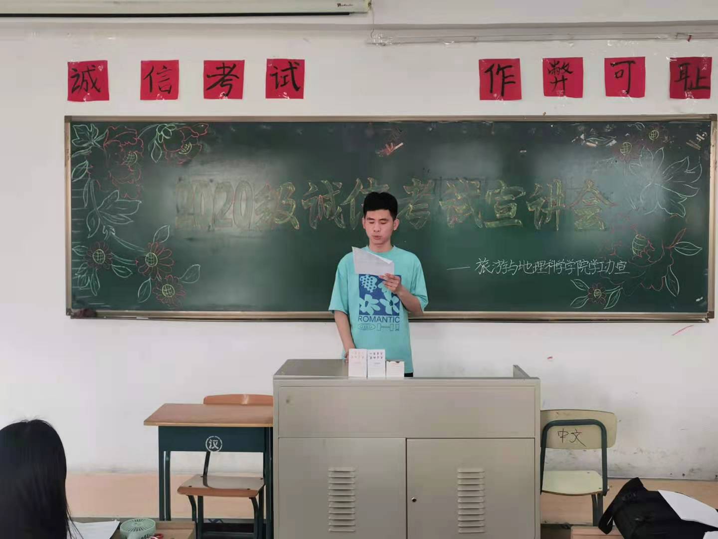 仲夏将至,等待同学们的还有最后的一场战役--期末考试。距离期末考试仅剩不到两个星期,整个学校进入了一个无比紧张的环节,校园的各处都充斥着浓浓的学习氛围。因此,旅游与地理科学学院于6月17日晚六点在老校区3322教室召开2020级诚信考试宣讲会,旅游与地理科学学院辅导员何珊珊老师主持召开会议。