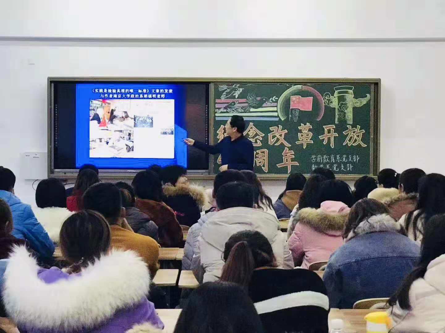 为纪念改革开放40周年,吉林师范大学博达学院数学系师生联合党支部和学前教育系于2018年11月21日联合邀请了吉林师范大学周亚东教授在综合楼1313教室开展以“伟大壮举,时代传奇”为主题的讲座。