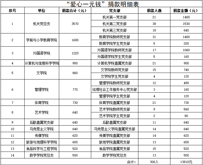 学校按照募集善款的总金额,按照每人发放1000元的标准确定学校名额。优先资助资助暑期受到台风摩羯灾害的学生11人,剩余名额的50%按照各学院学生募集善款的比例下发至各学院;剩余名额的另外50%按照各学院特别困难学生的比例下发至各学院。