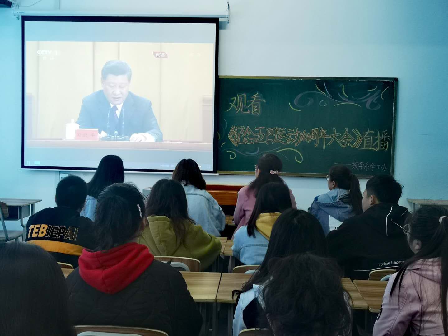 为纪念五四运动100周年,充分激发广大青年学子学习报国热情,进一步弘扬“爱国、进步、民主、科学”的五四精神,引导广大学生牢固树立中国特色社会主义理想信念,做听党话跟党走的新时代好青年,数学系学工办于4月30日上午10:30在综合楼1108教室组织开展了观看《纪念五四运动100周年大会》直播活动,参与此次活动的有数学系学工办主任常秀云老师,辅导员郑鑫老师以及各班学生干部和学生代表。