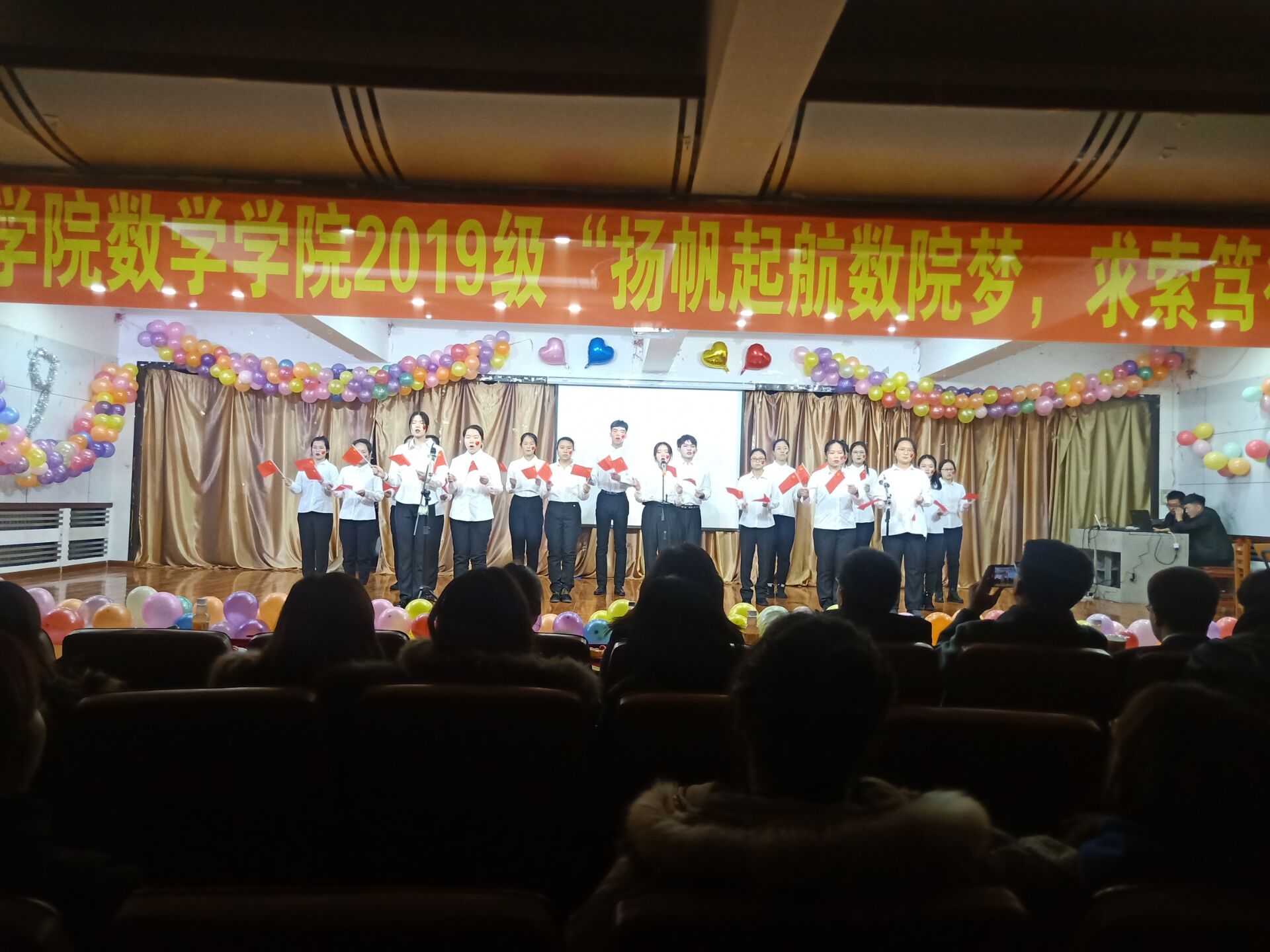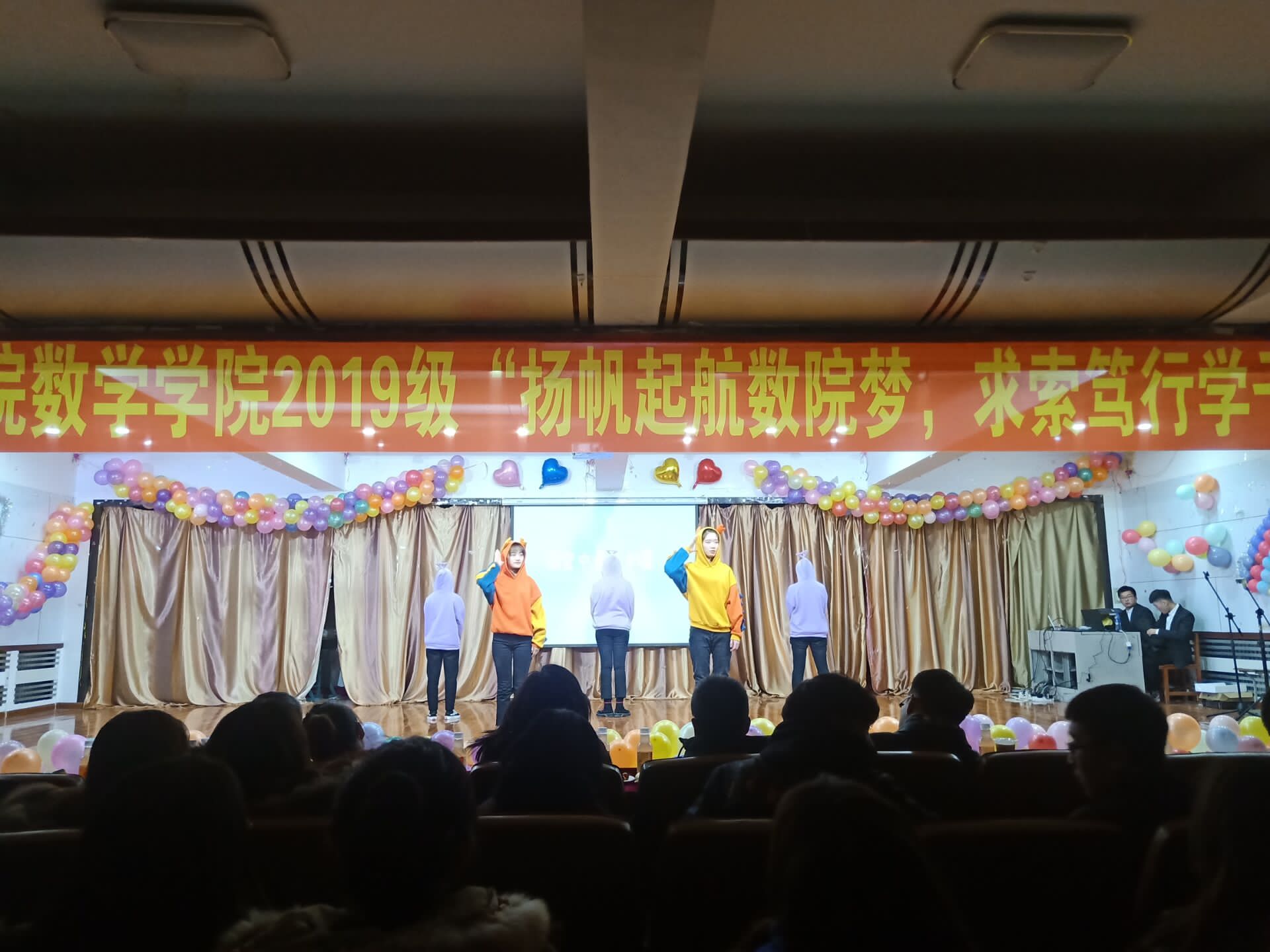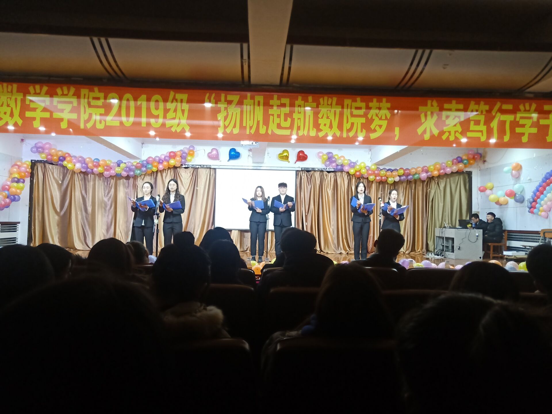 为了丰富校园文化,活跃学习氛围,增强学生凝聚力,帮助2019级同学们更快的融入大学生活,给新同学们一个展示自我风采的舞台。2019年12月6日,数学学院在第二教学楼六楼报告厅举办了“扬帆起航数院梦 求索笃行学子心 ”迎新晚会,在活动中激发同学们的青春活力与集体精神,为崭新的大学生活描下绚丽的一笔。出席本次活动的有数学学院院长陶袁院长,团委书记李重言老师,学工办主任常秀云老师,学前与小学教育学院辅导员崔鑫月老师,数学学院辅导员郑鑫老师、辅导员高泽老师,校团学联学生干部,数学学院全体学生干部和2019级全体同学。