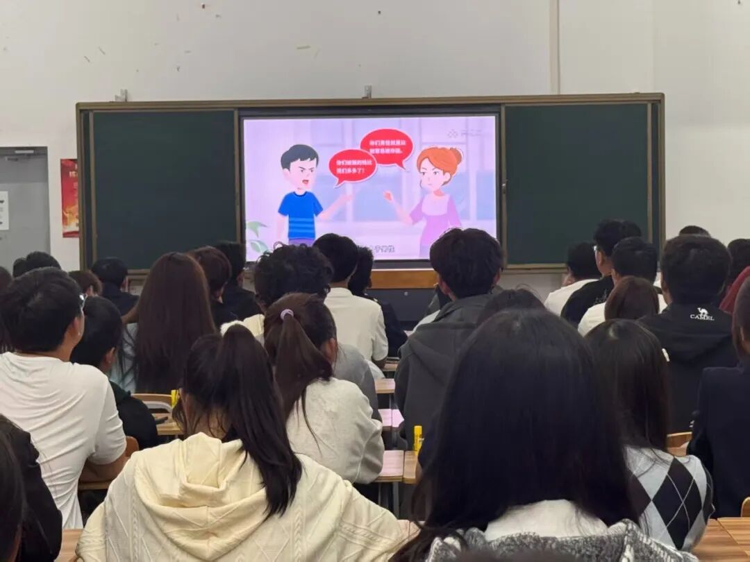 活动当晚,两个教室座无虚席,新生们井然有序,认真观看。视频内容紧扣当前高校高发的电信网络诈骗典型案例,通过真实的案情再现、精准的骗局剖析和权威的防范指南,深刻揭示了诈骗分子的常用手法和话术,直观地展现了诈骗给受害者带来的巨大财产损失与精神伤害。
