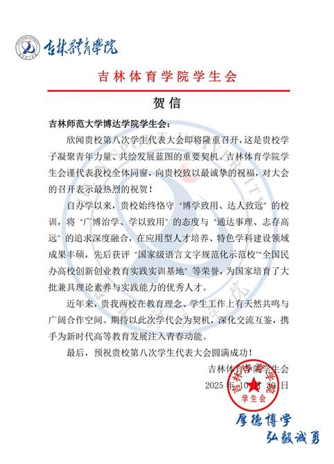 大会还受到来自兄弟院校,吉林体育学院、长春光华学院、东北电力大学等高校学生会的祝贺。下面让我们一起来回顾本次大会!