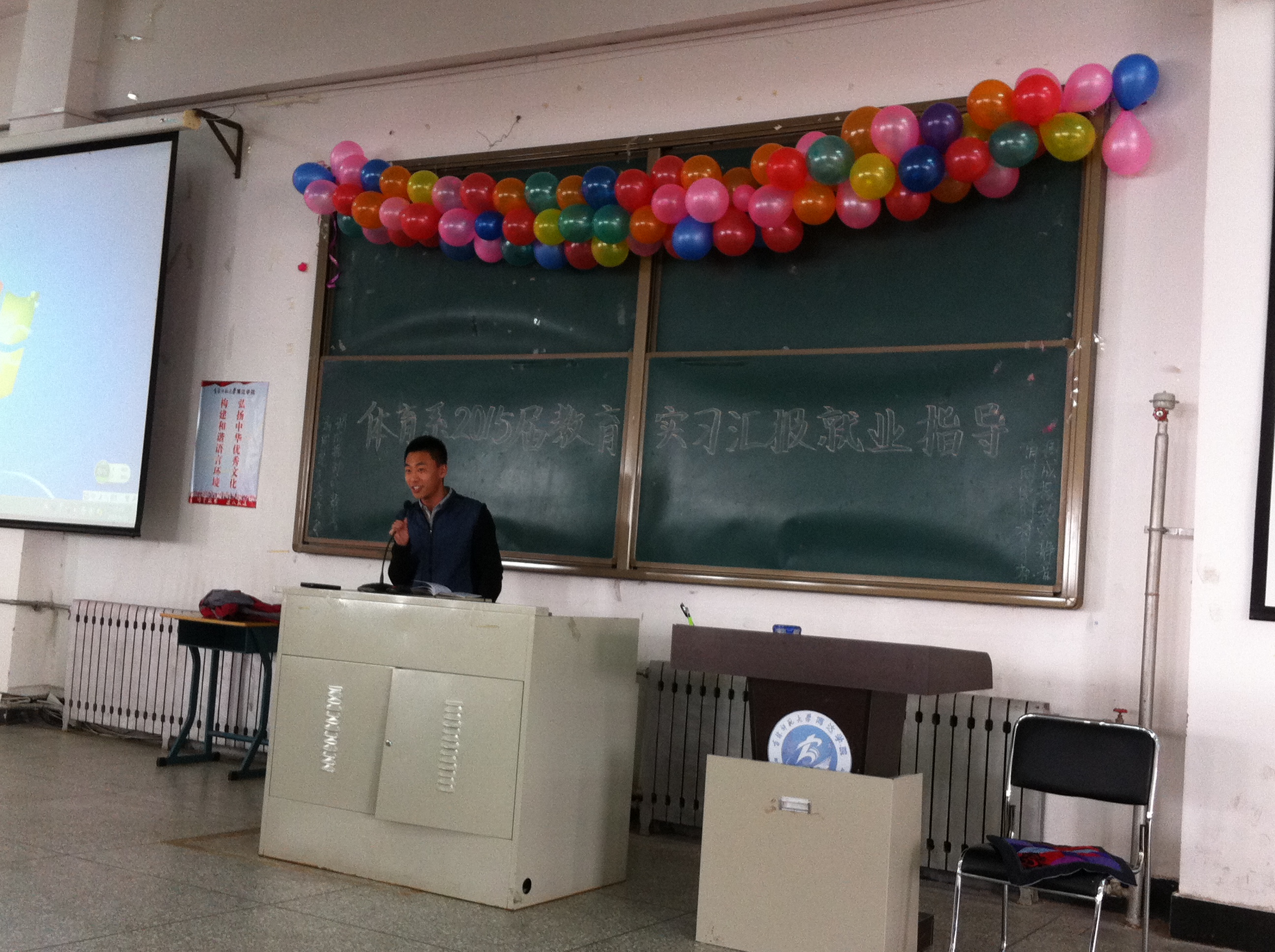 2013届体育教育专业毕业生刘冬梅、2015届体育教育专业毕业生祁晨、郭峰,结合自身学习、求职、工作经历进行了经验交流,用自己的切身经历为体育系全体学生做了一次生动的就业指导和经验交流报告。