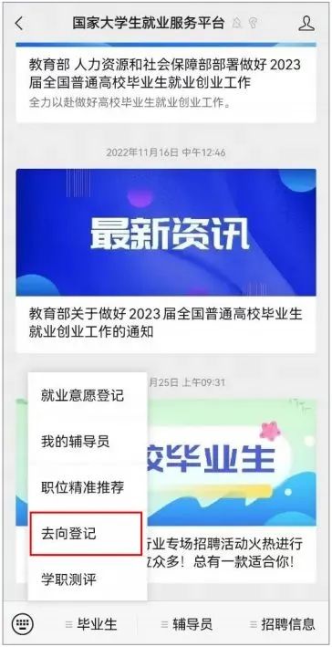关注绑定“国家大学生就业服务平台”公众号,点击“去向登记”直接登录。