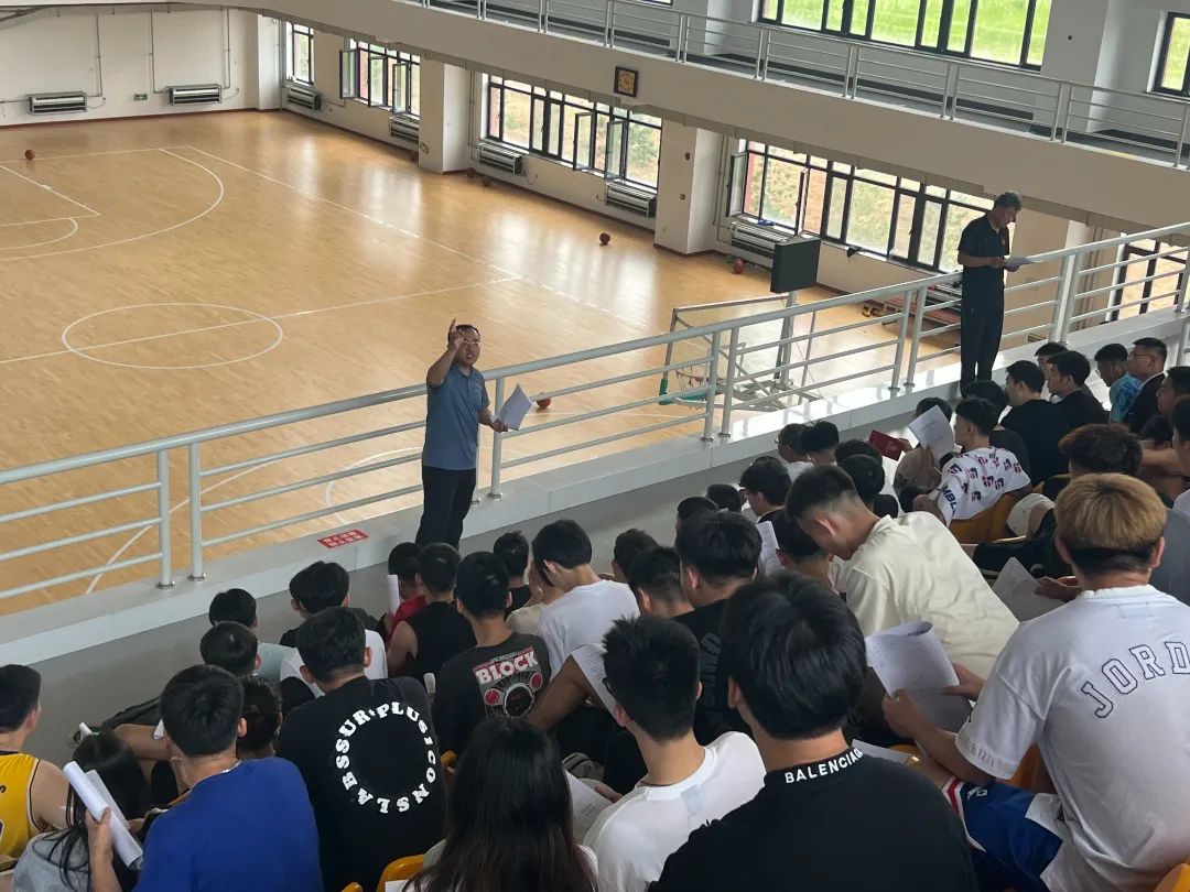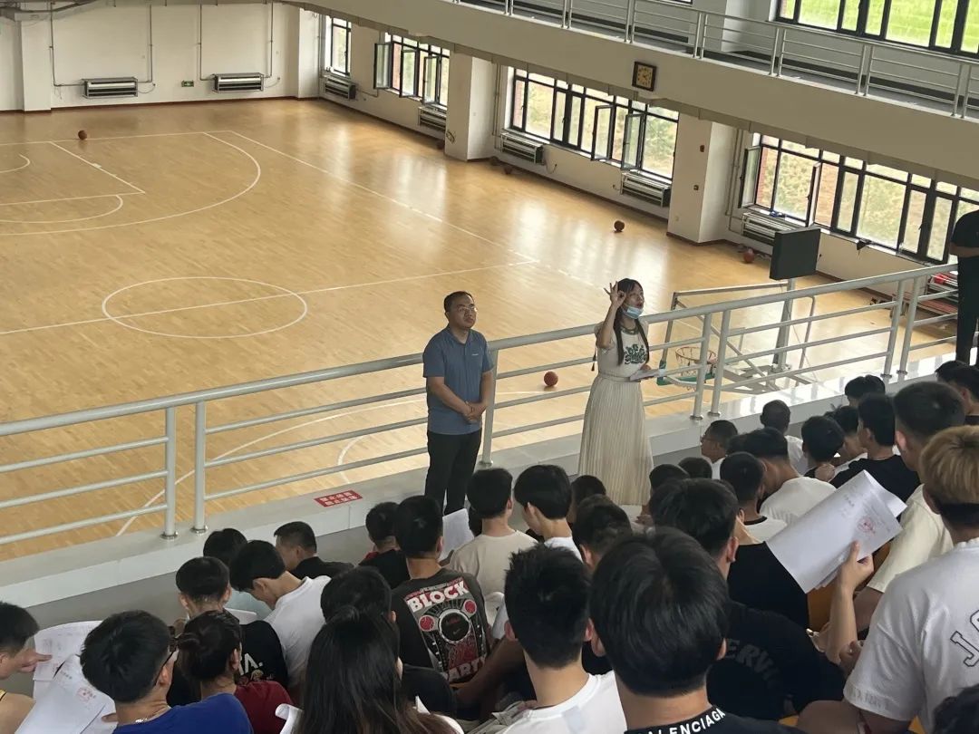 金色秋月,在凉风习习中,我院师生在体育馆看台展开了新学期期初大会,新学期、新起点、新气象,此次大会为同学们在新学期的学习工作做了简单规划。出席本次大会的有学生办主任杜振兴、辅导员夏师澄老师以及2021级和2022级全体学生。