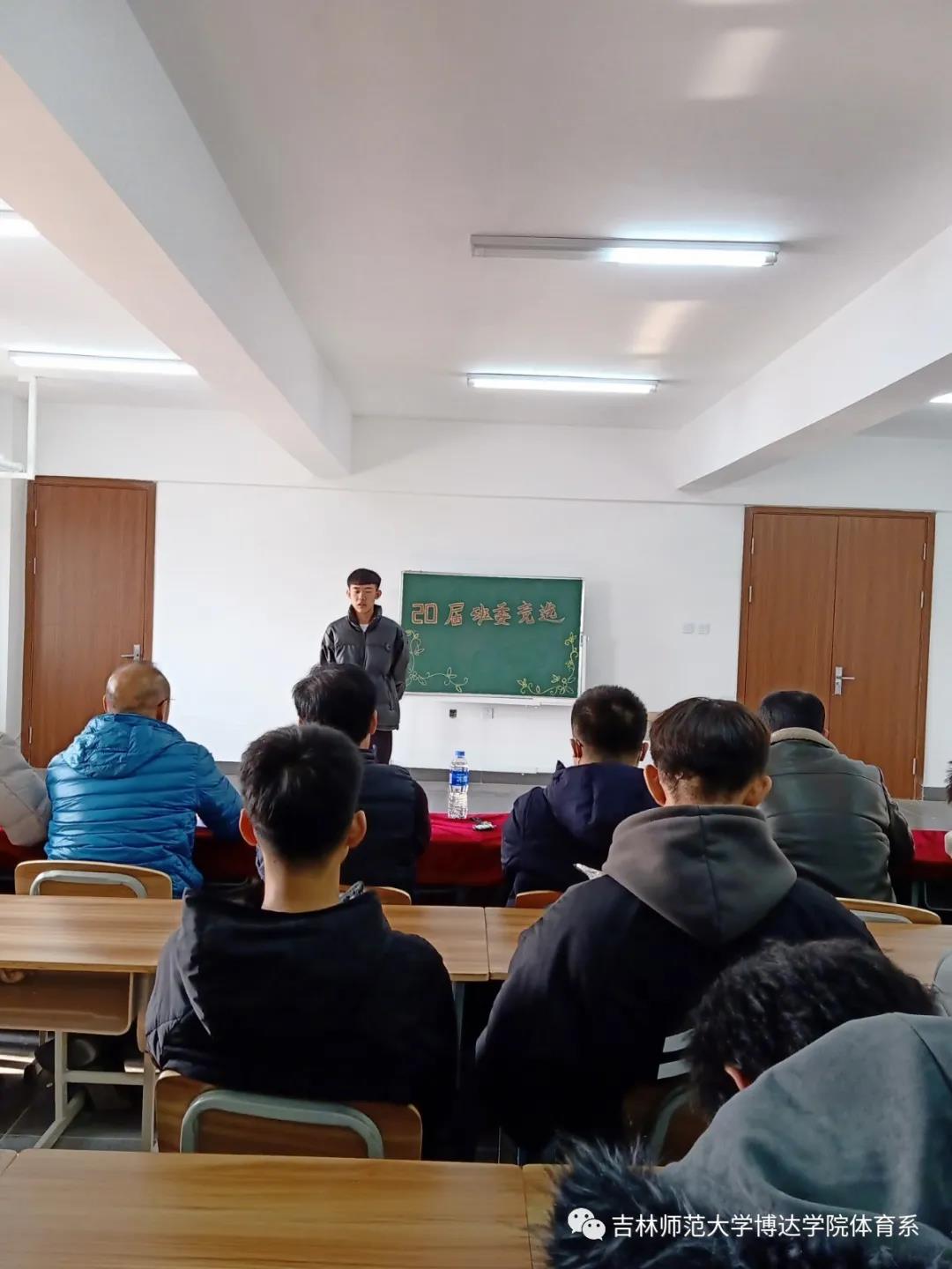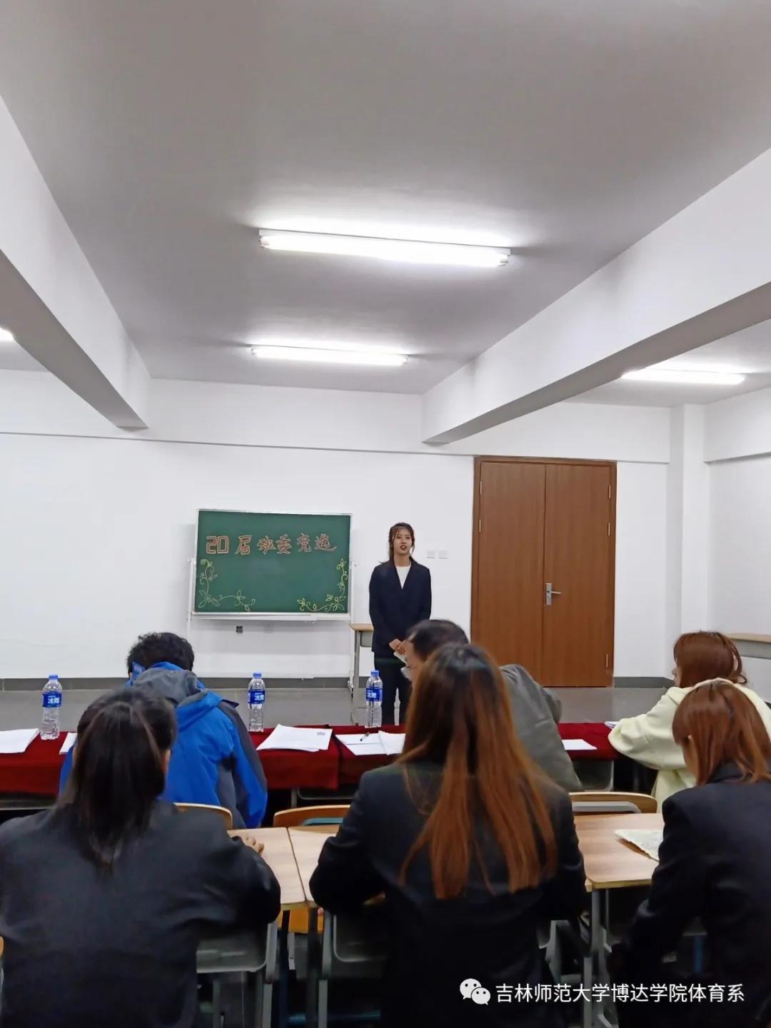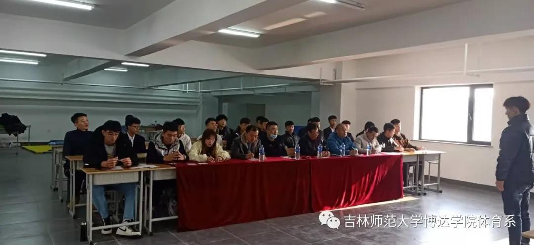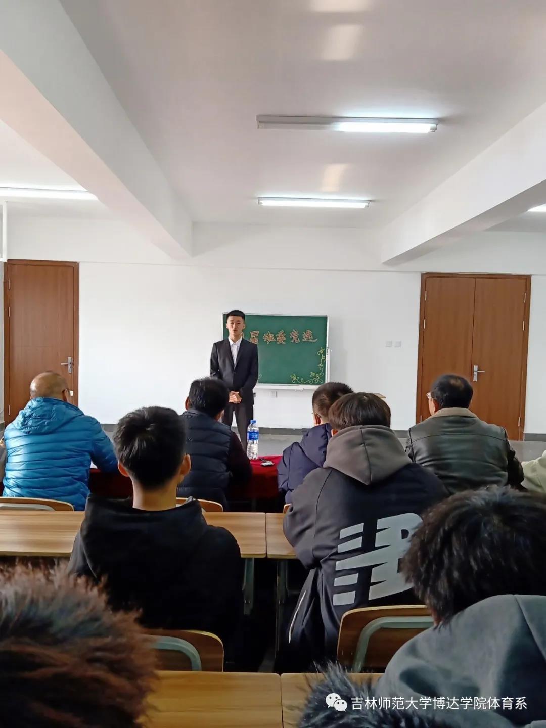 2020年11月12日,吉林师范大学博达学院体育学院在体育馆进行了2020级新生班干部竞选。参加此次竞选的有邵连成副院长,陈立春副院长,学工办主任杜振兴老师,辅导员刘岩老师,学生会主席团以及各班班代。