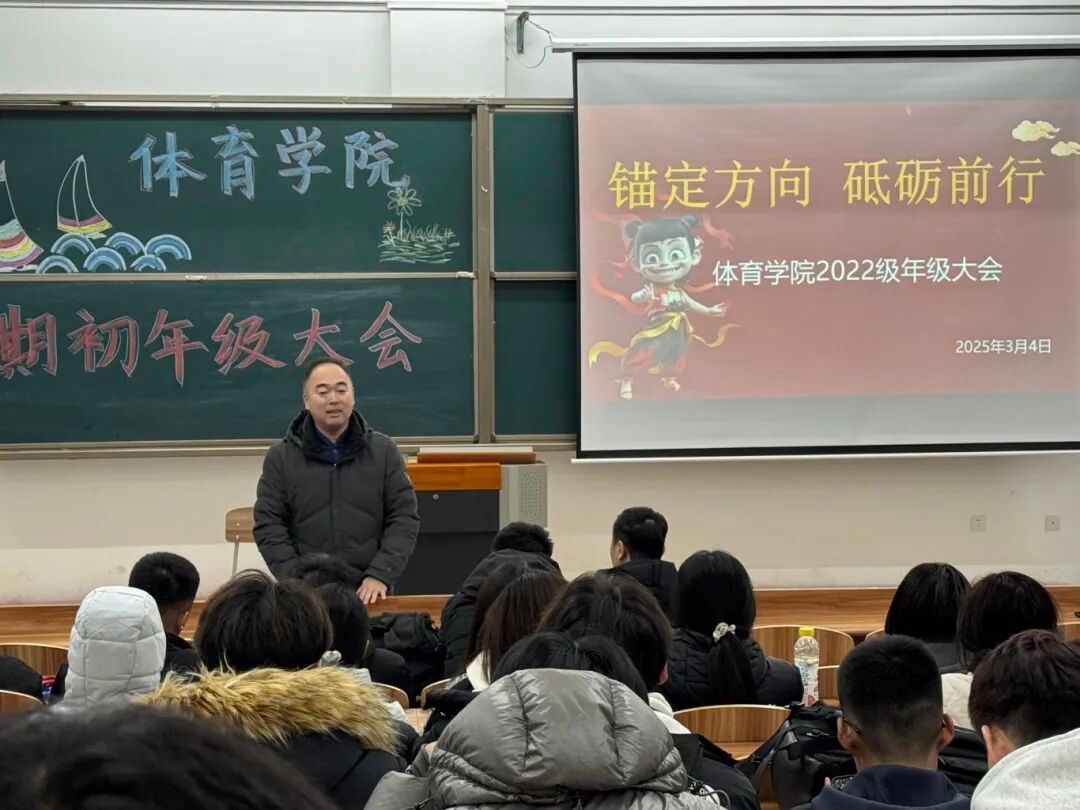 3月5日,体育学院召开新学期期初年级大会。副院长李重言、学工办主任柳杨、辅导员杨小依参加此次大会,本次大会由柳杨老师主持。大会以“锚定方向,砥砺前行”为主题,为体育学院全体同学明确方向,凝聚力量,开启了体育学院新学年的崭新篇章。