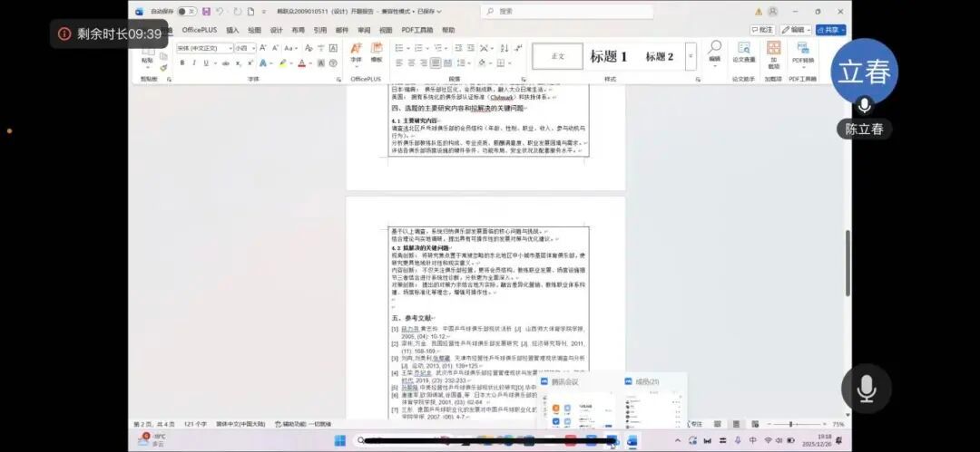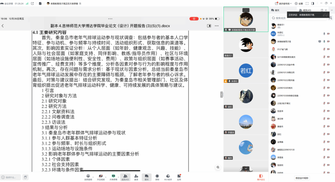 12月26日晚6点,体育学院2026届毕业论文开题答辩会以线上形式顺利举行。本次答辩会共有118名毕业生参与,16名教师担任答辩评审,答辩工作分为三组同步开展,各组由组长主持推进。