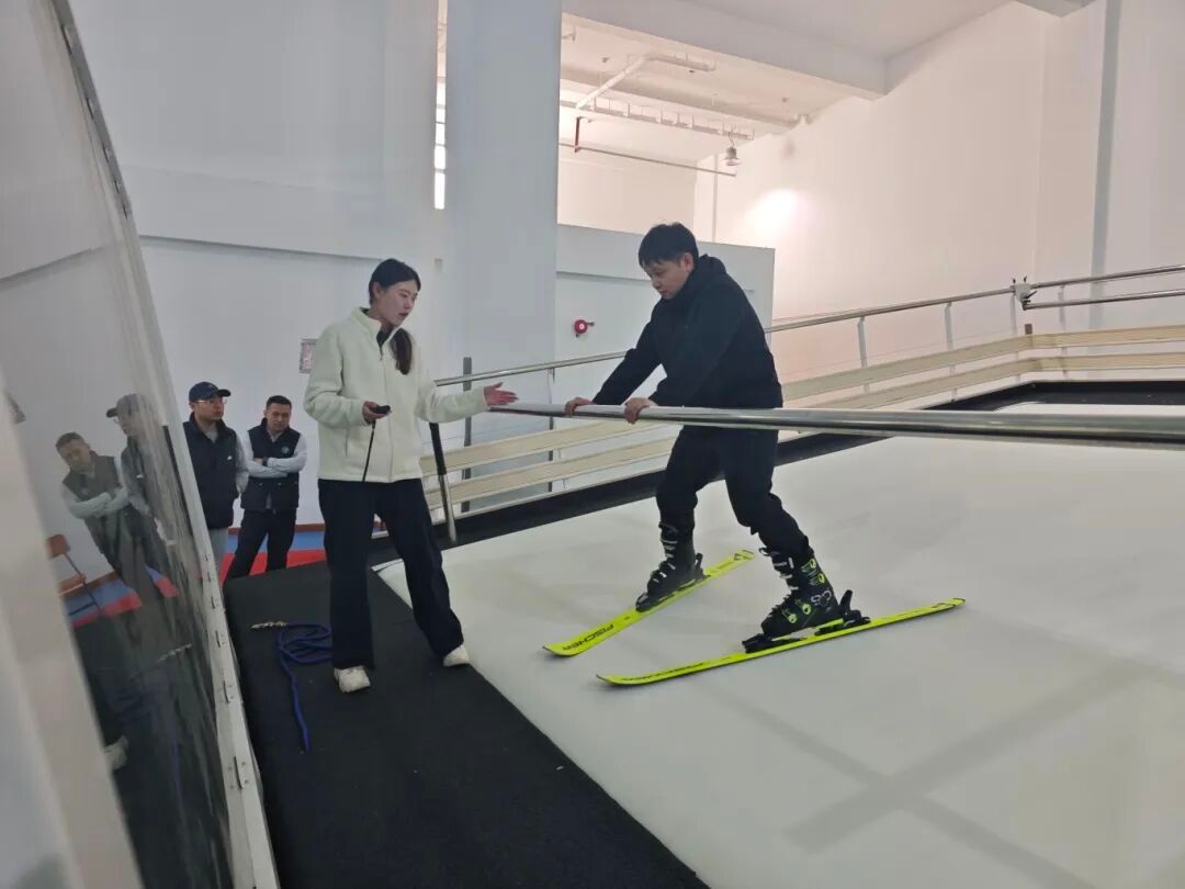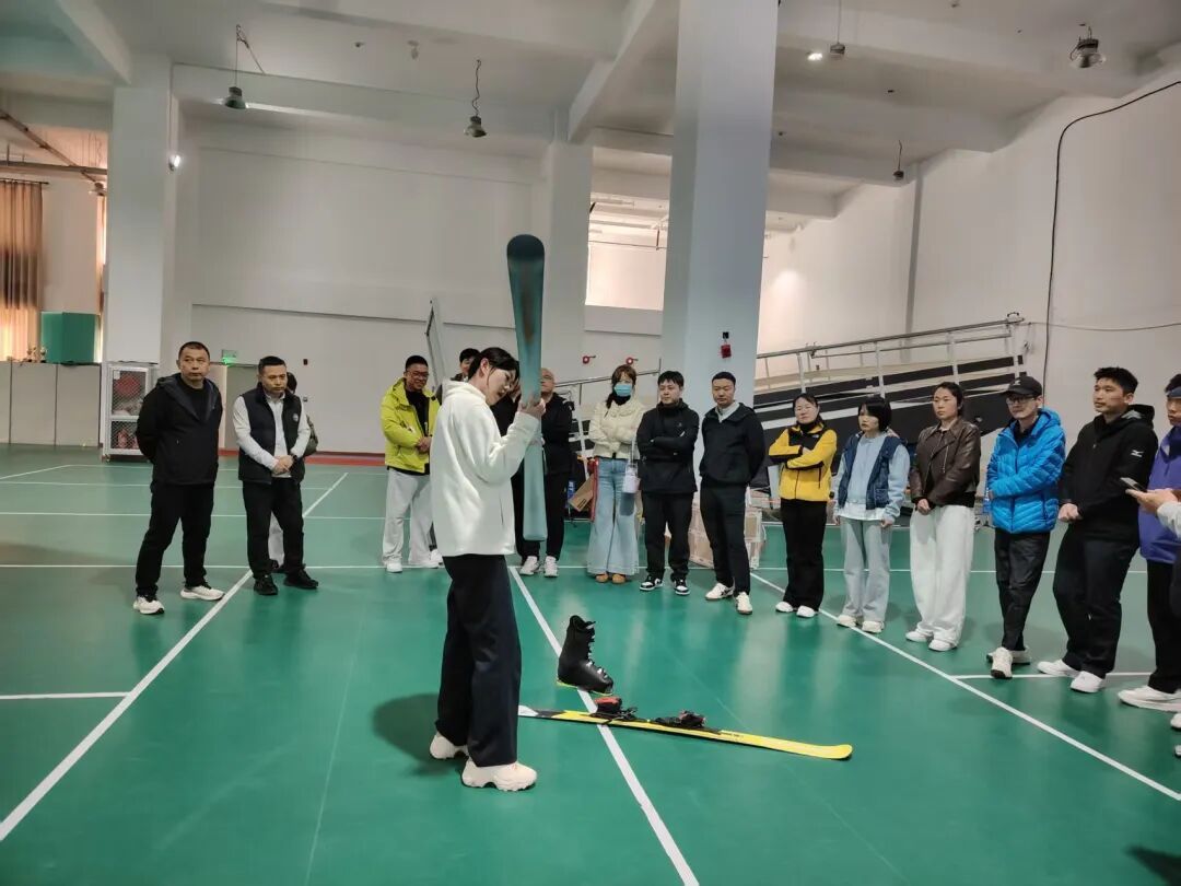 活动中,吕悦老师围绕滑雪运动的核心技能,结合新引进滑雪机的操作特点,系统讲解了滑雪装备的选择与使用、基本滑行姿势的要领以及犁式滑行动作的技术规范,讲解条理清晰、重点突出,兼顾理论性与实操性。在互动体验环节,教师们借助新引进的滑雪机积极参与实践操作,在吕悦老师的现场指导下,反复练习滑行动作、交流教学难点,现场互动频繁、氛围浓厚,切实将理论知识转化为实操能力。