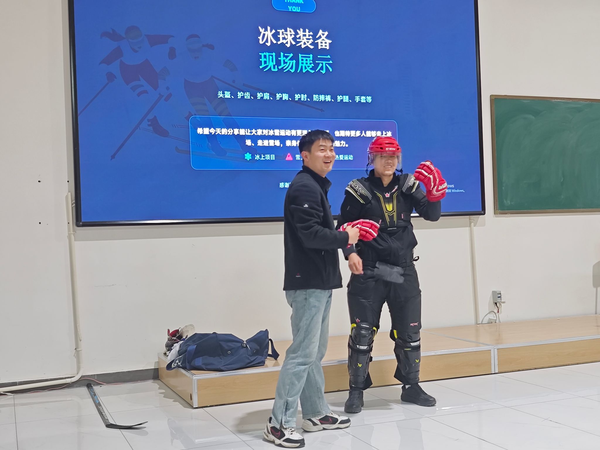 焦博彭围绕“冰雪运动项目介绍与装备规范”进行专题分享。他首先梳理了当前高校冰雪运动课程的主要方向,涵盖滑冰、滑雪、冰壶及冰球等项目,重点分析了不同项目在技术入门、体能训练与安全防护上的教学差异。随后,焦教师结合实物与图示,系统讲解了冰雪运动通用防护装备的穿戴规范,包括头盔、护膝、护肘、手套及对应项目的专项护具,并强调了“装备适配”与“动作规范”双线并行的教学原则。