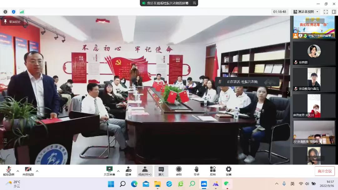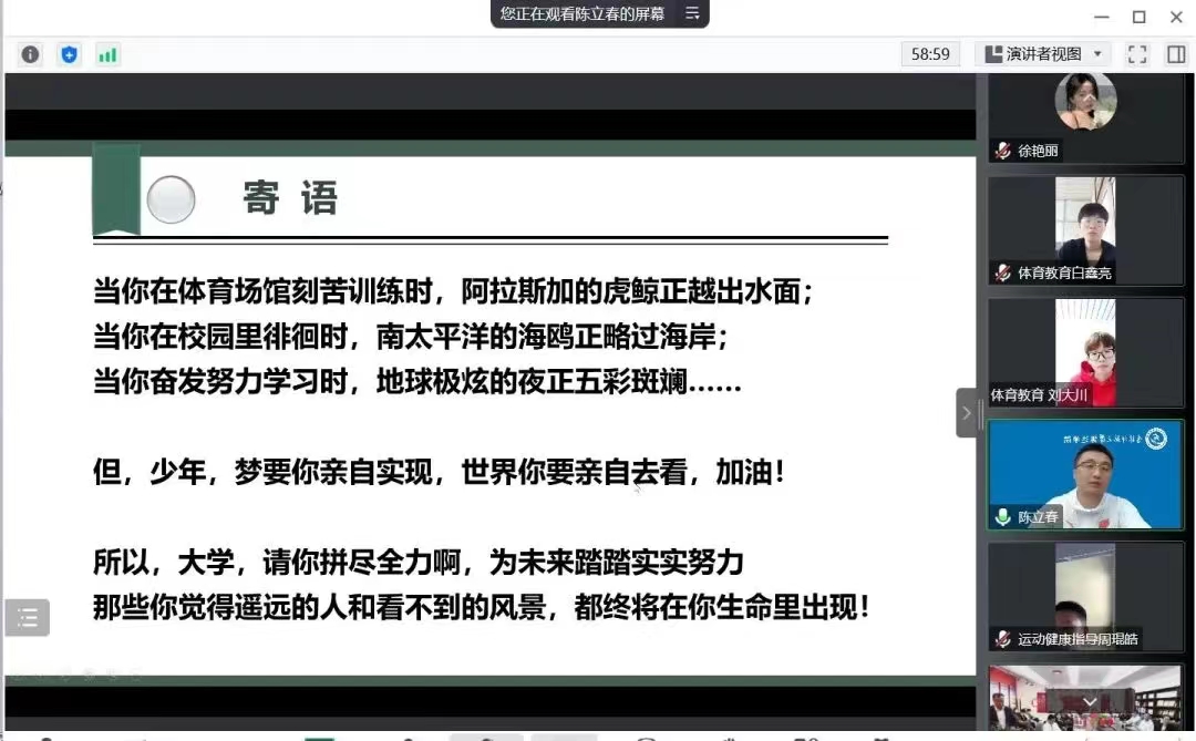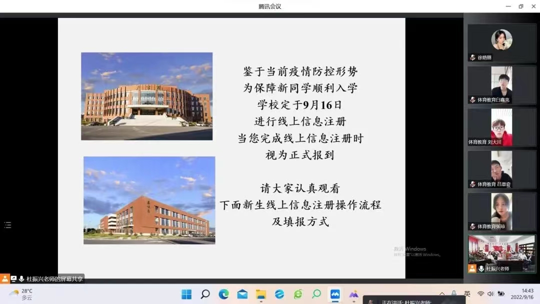 为促进我院2022级新生对学校及学院的了解,帮助新生提前适应大学的学习和生活,2022年9月16日,我院通过线上会议的形式召开新生见面会。会议由学工办主任杜振兴老师主持,参加会议的有体育学院全体教师和2022级所有新生。