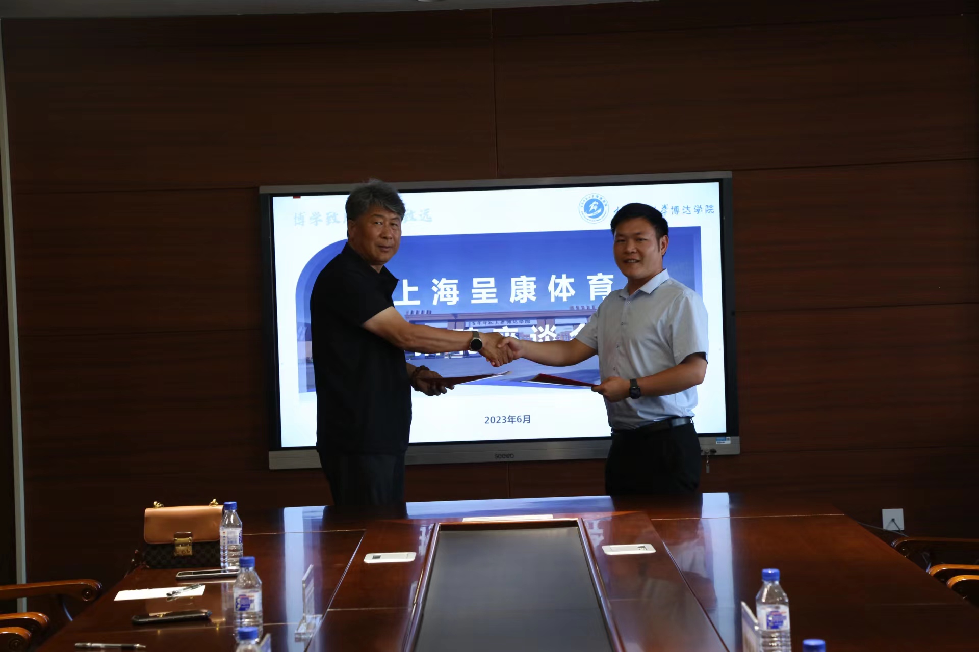 吉林师范大学博达学院体育学院副院长袁吉和呈康体育校企部经理韩泽上台签约。