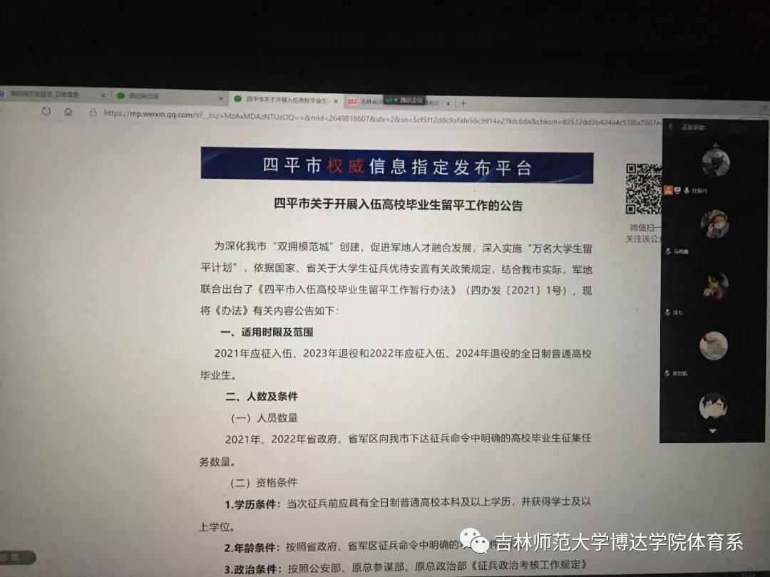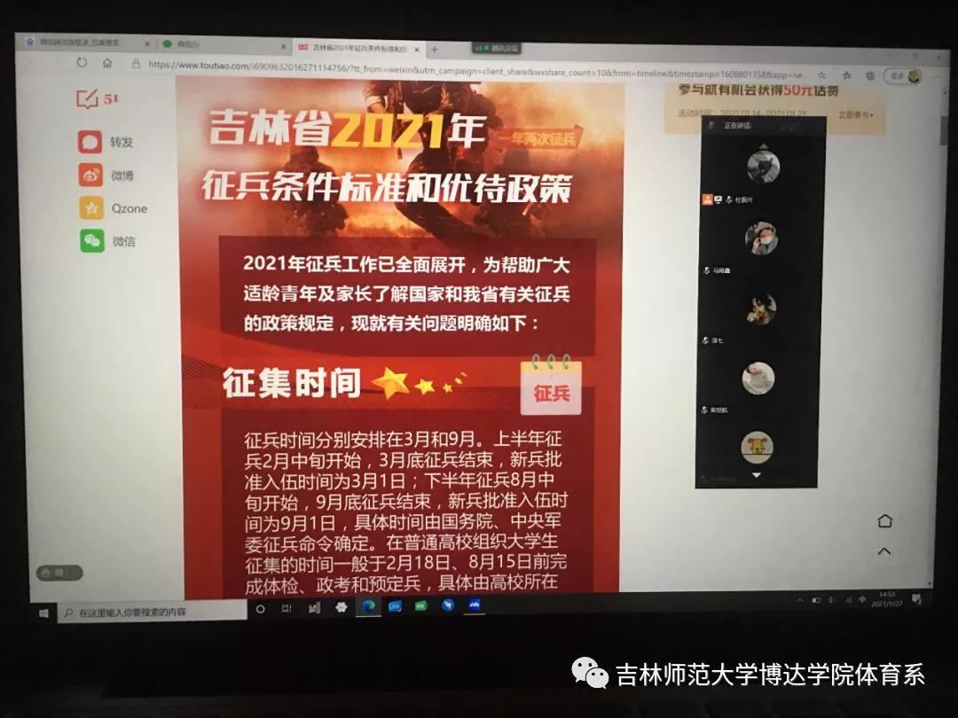 2021年1月22日下午3点通过线上宣讲的方式,吉林师范大学博达学院体育学院党支部书记杜振兴老师充分的为我们介绍了2021年征兵条件标准和优待政策。