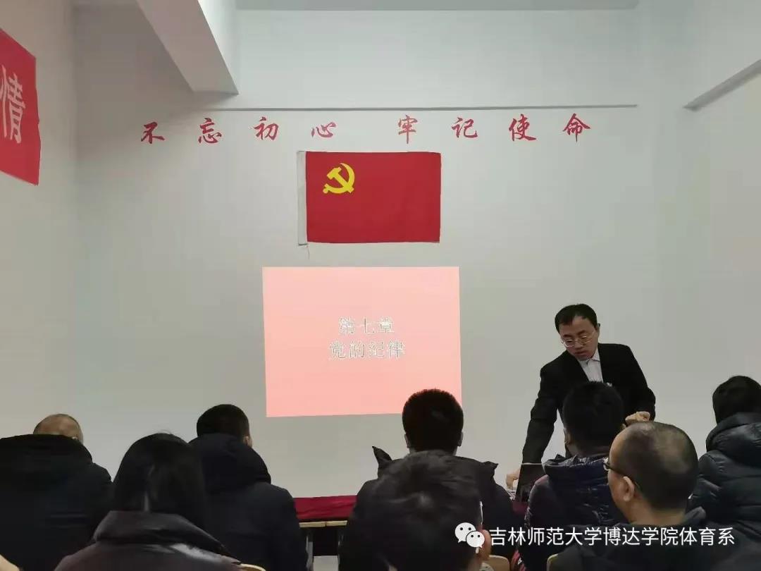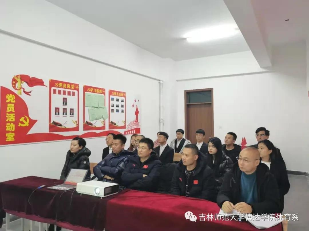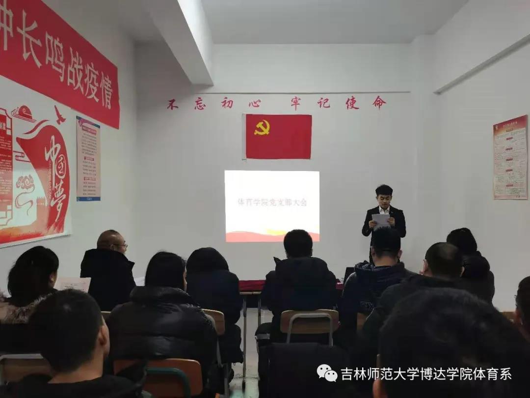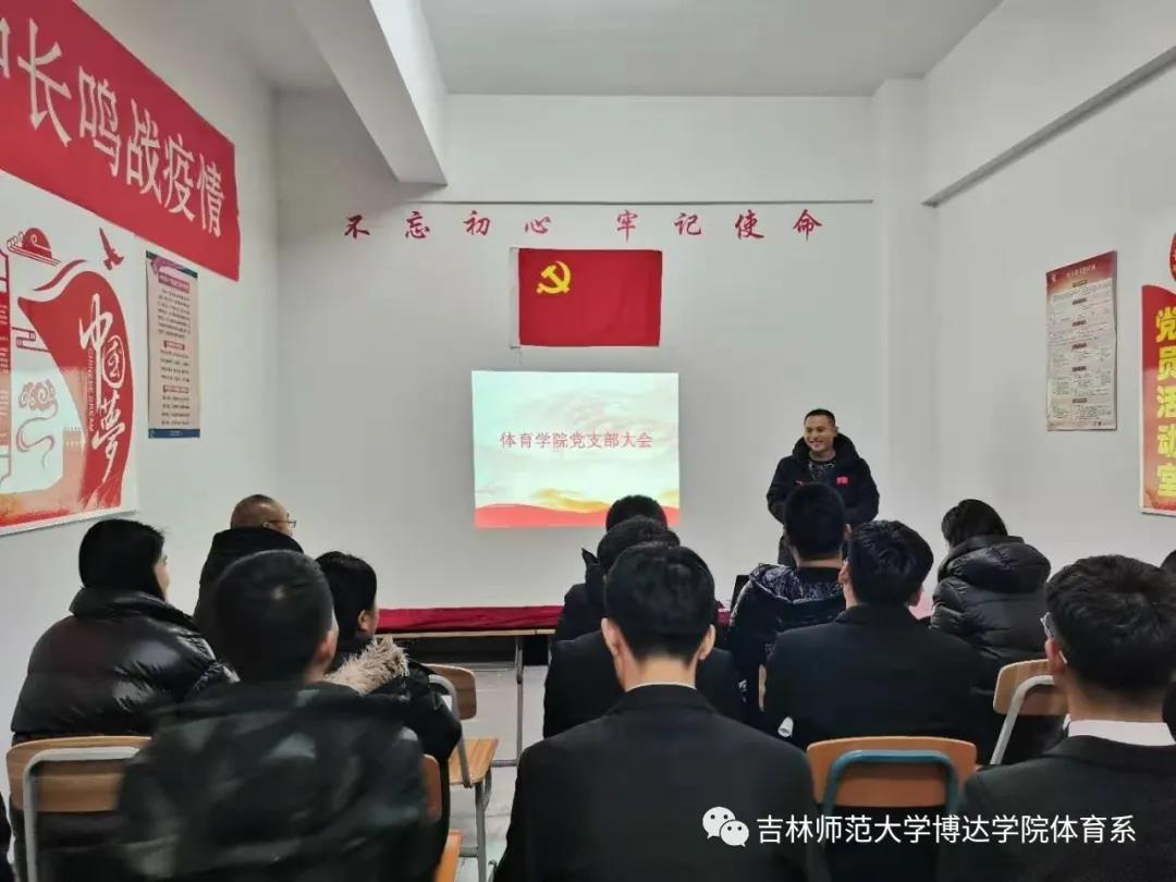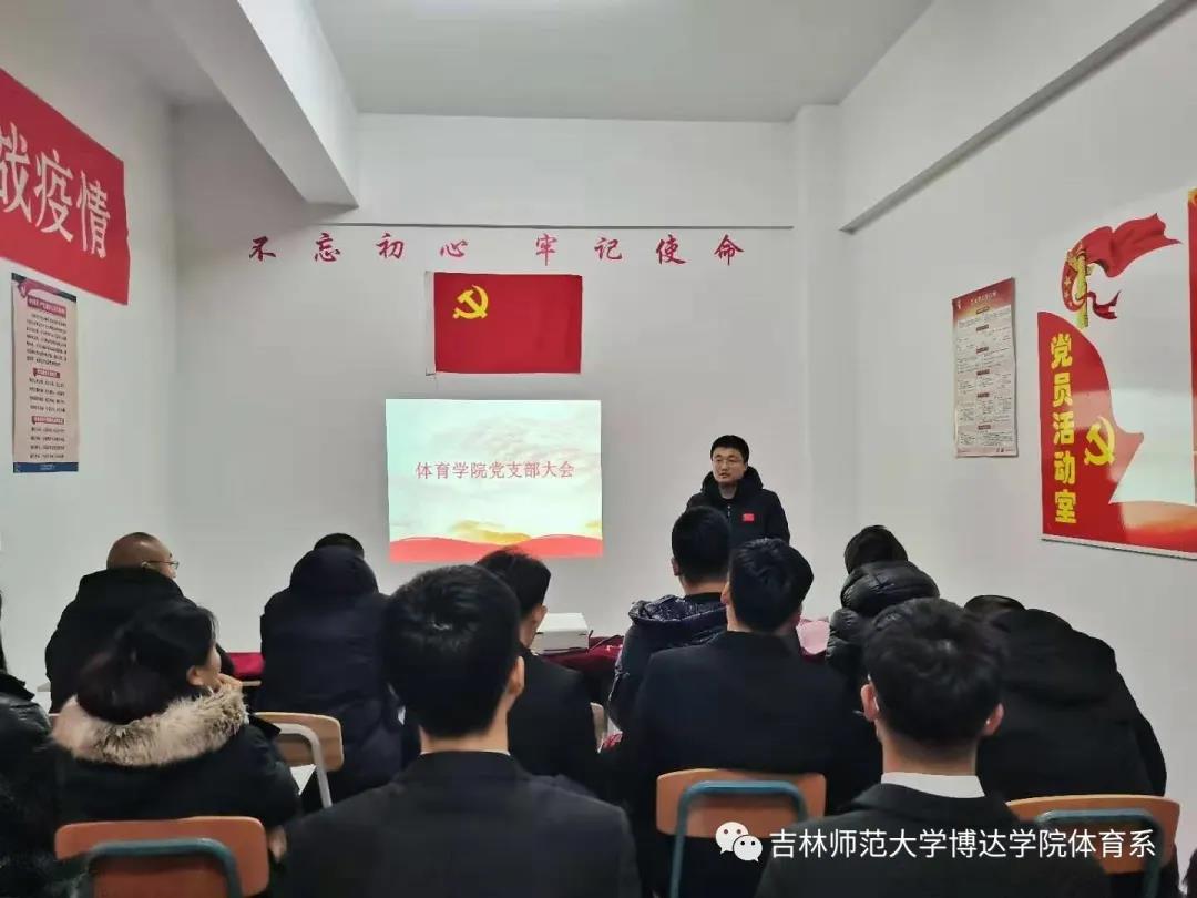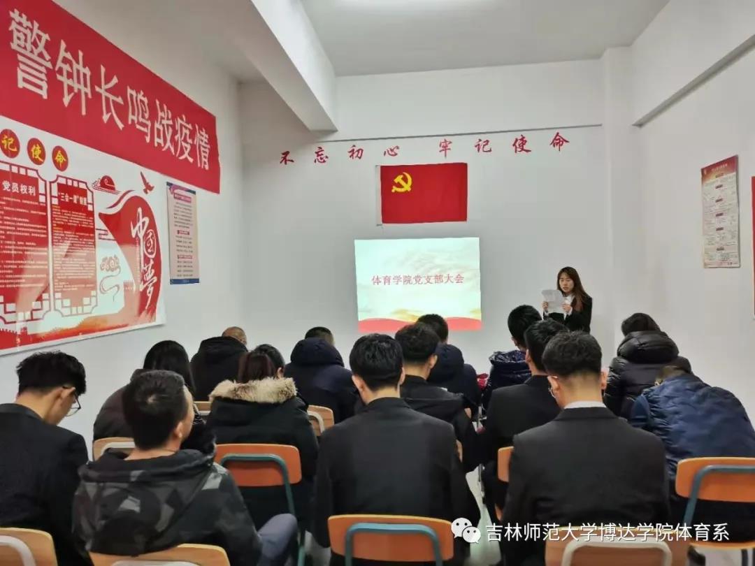 “不忘初心,砥砺前行”。为保证中国共产党的先进性,培养具有创新意识的优秀共产党员。2020年11月25日,吉林师范大学博达学院体育学院直属党支部在体育馆党员活动室召开了党支部大会,主持此次大会的是体育学院学生党支部书记杜振兴老师,参加本次大会的有体育学院教师党员、学生党员以及本次大会七位党员发展对象和两位预备党员。