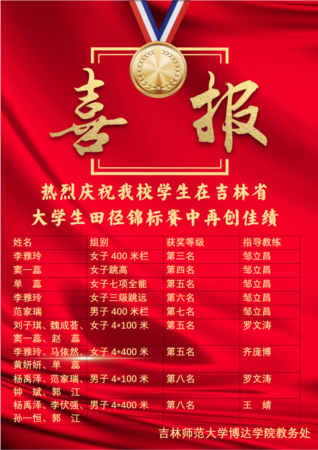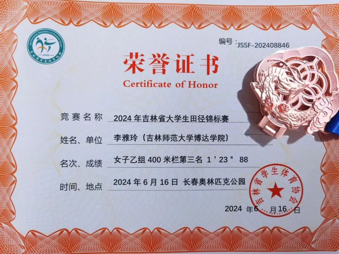 吉林师范大学博达学院体育学院,在2024 吉林省大学生田径锦标赛中书写了浓墨重彩的一笔。本次比赛陈立春院长为领队,邹立昌老师担任总教练,王婧、罗文涛、齐庞博老师担任指导教练,我院分在精英组,本组由吉林体育学院、吉林大学、吉林师范大学、东北电力大学等11支队伍,且皆为高水平运动员的激烈竞争,我院运动健儿不畏艰难,顽强拼搏,最终斩获一枚女子400米栏铜牌,成功实现了学校在该赛事上从未有过的奖牌零的突破。