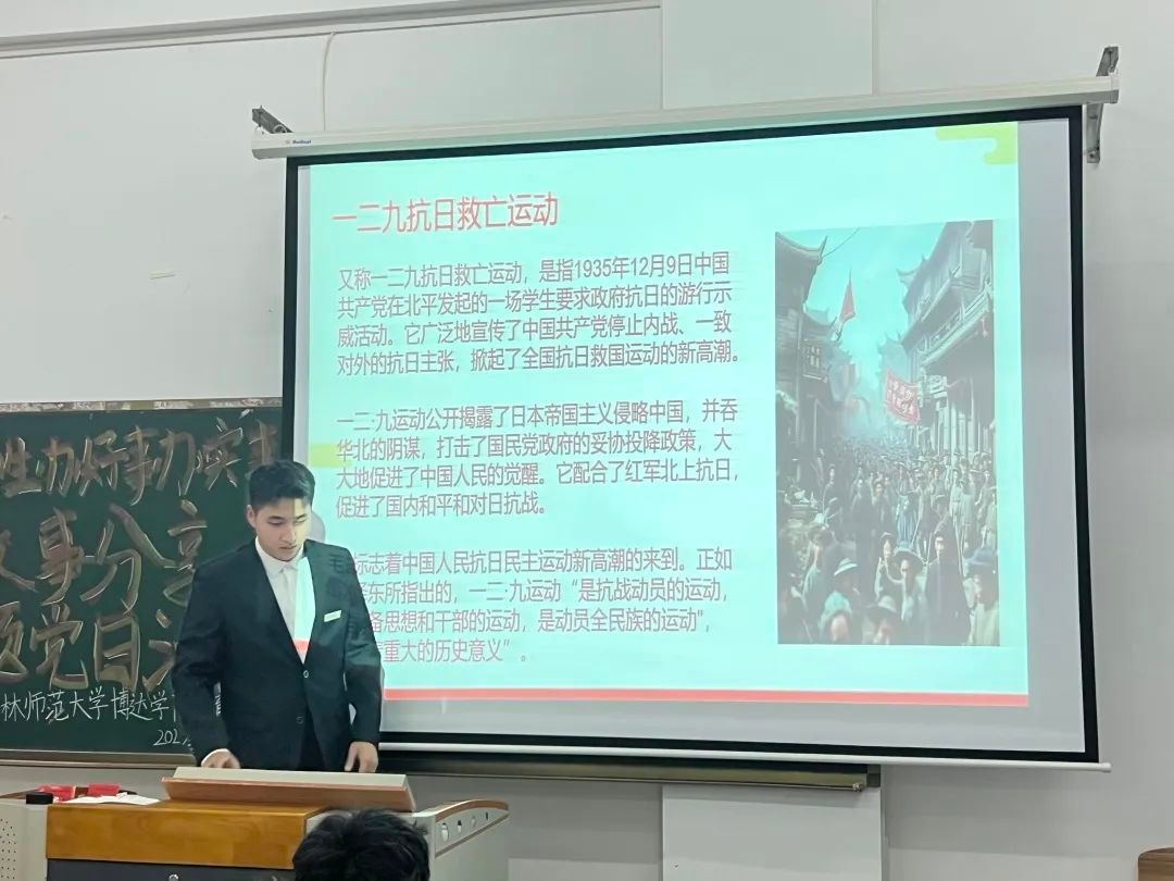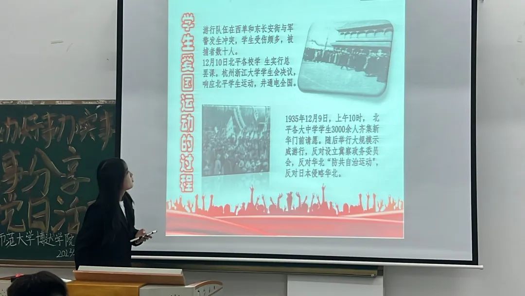 活动开始,学生代表们依次上台,用 PPT 的形式向大家详细介绍了“一二·九”运动的历史背景、过程和意义。他们用生动的语言和丰富的图片,将那个时代的青年学生们为了国家和民族的利益,勇敢地站出来,发起了这场伟大的爱国运动的场景呈现在大家面前。讲解过程中,同学们认真聆听,不时报以热烈的掌声。