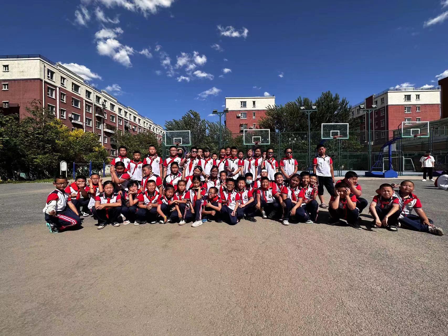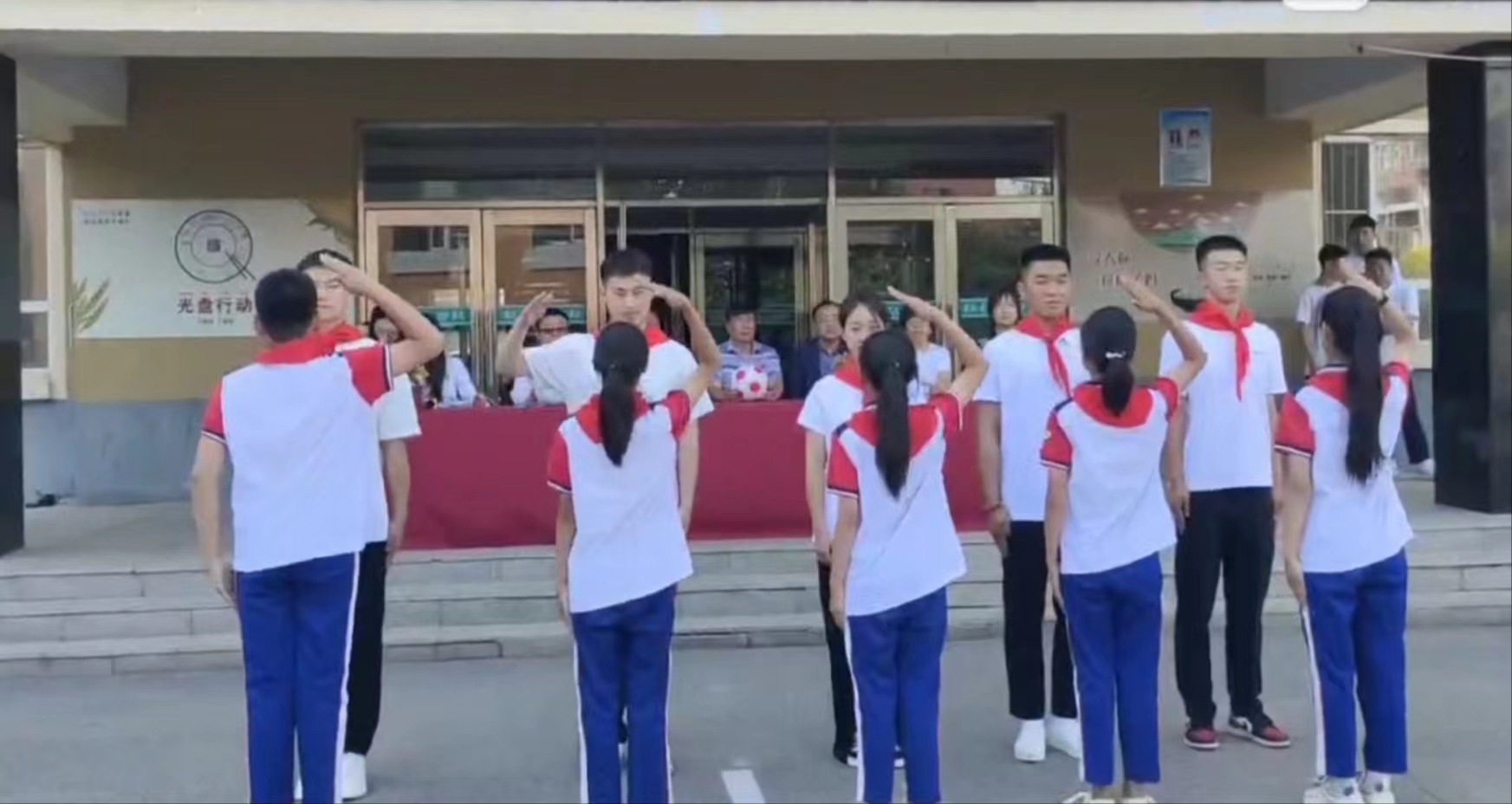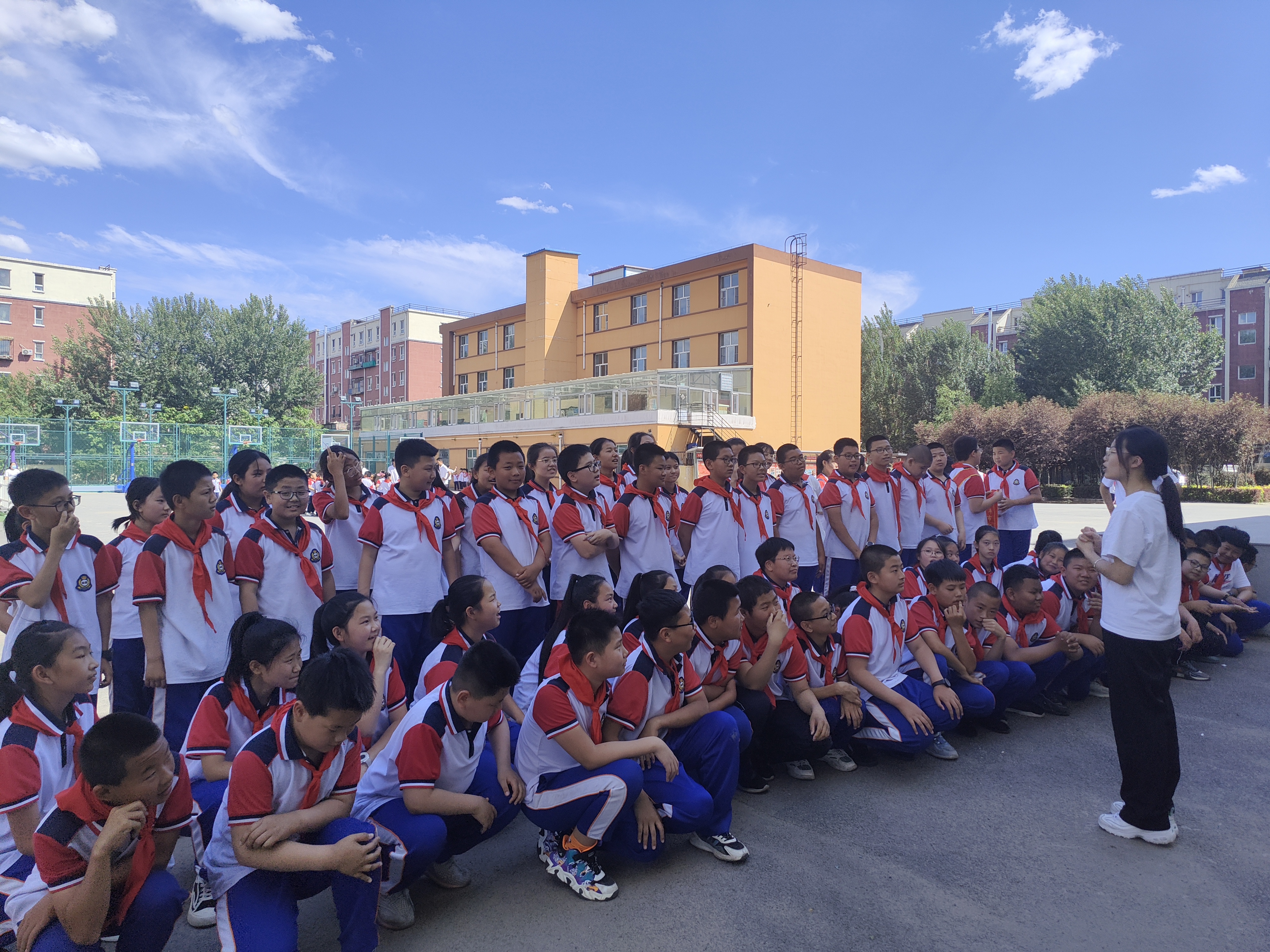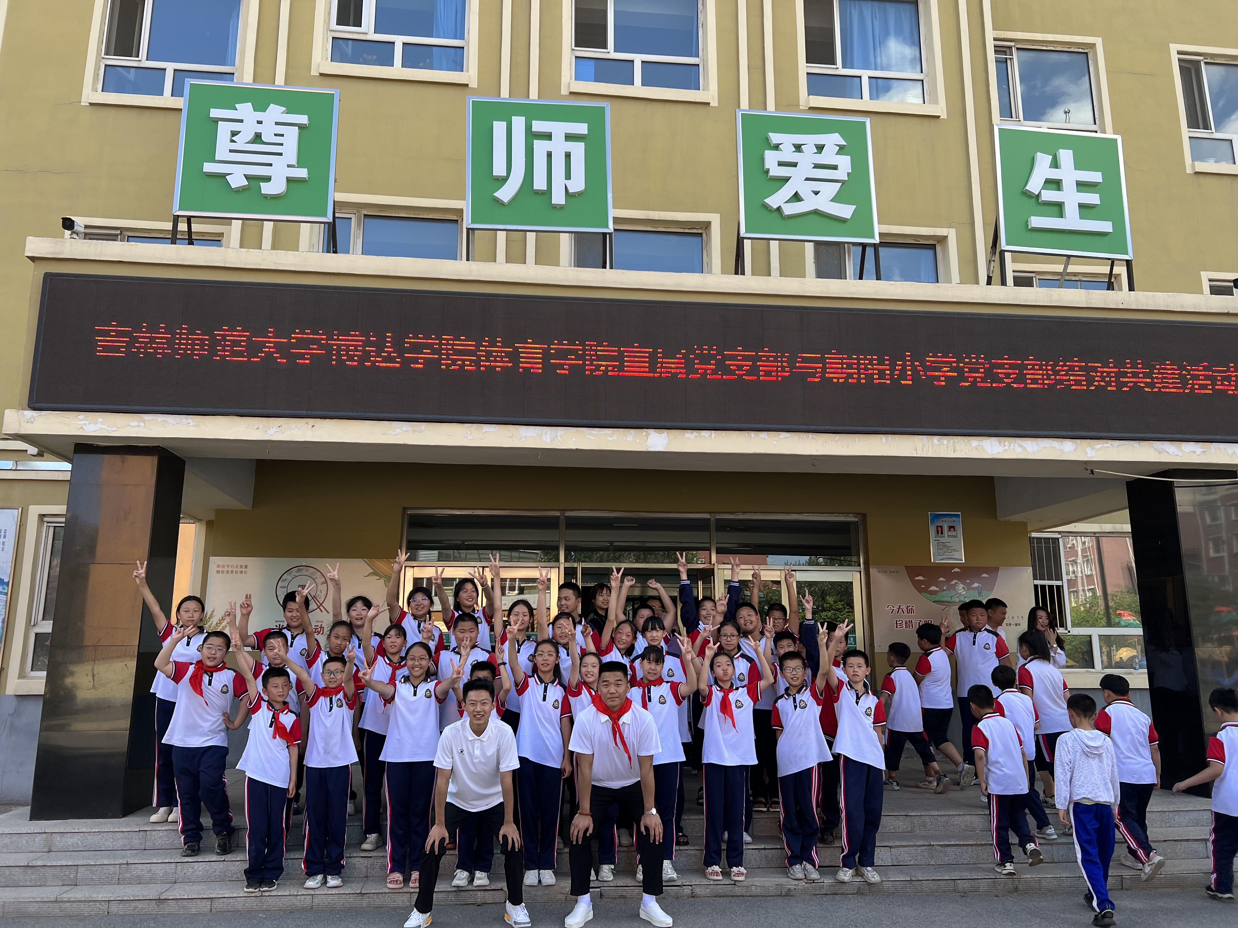 朝阳小学学生代表为体育学院学生代表佩戴红领巾。