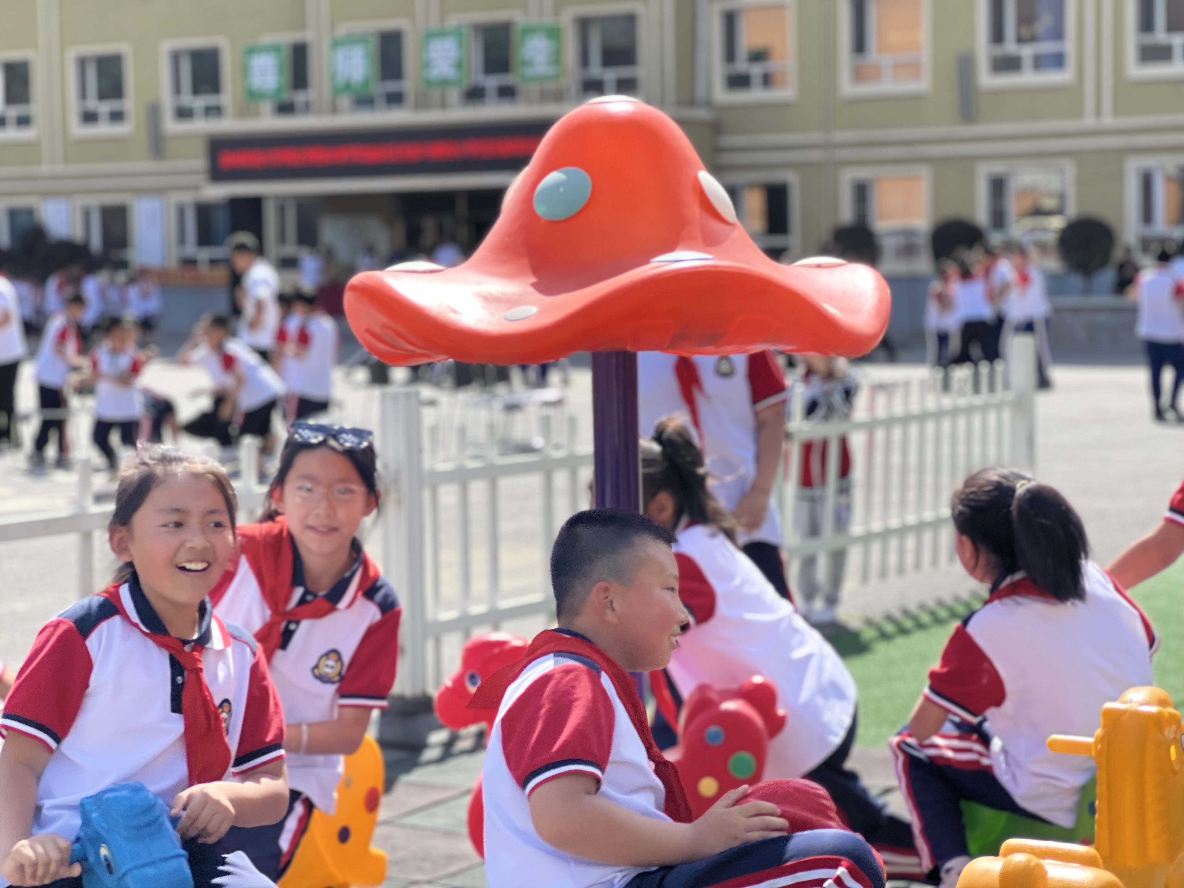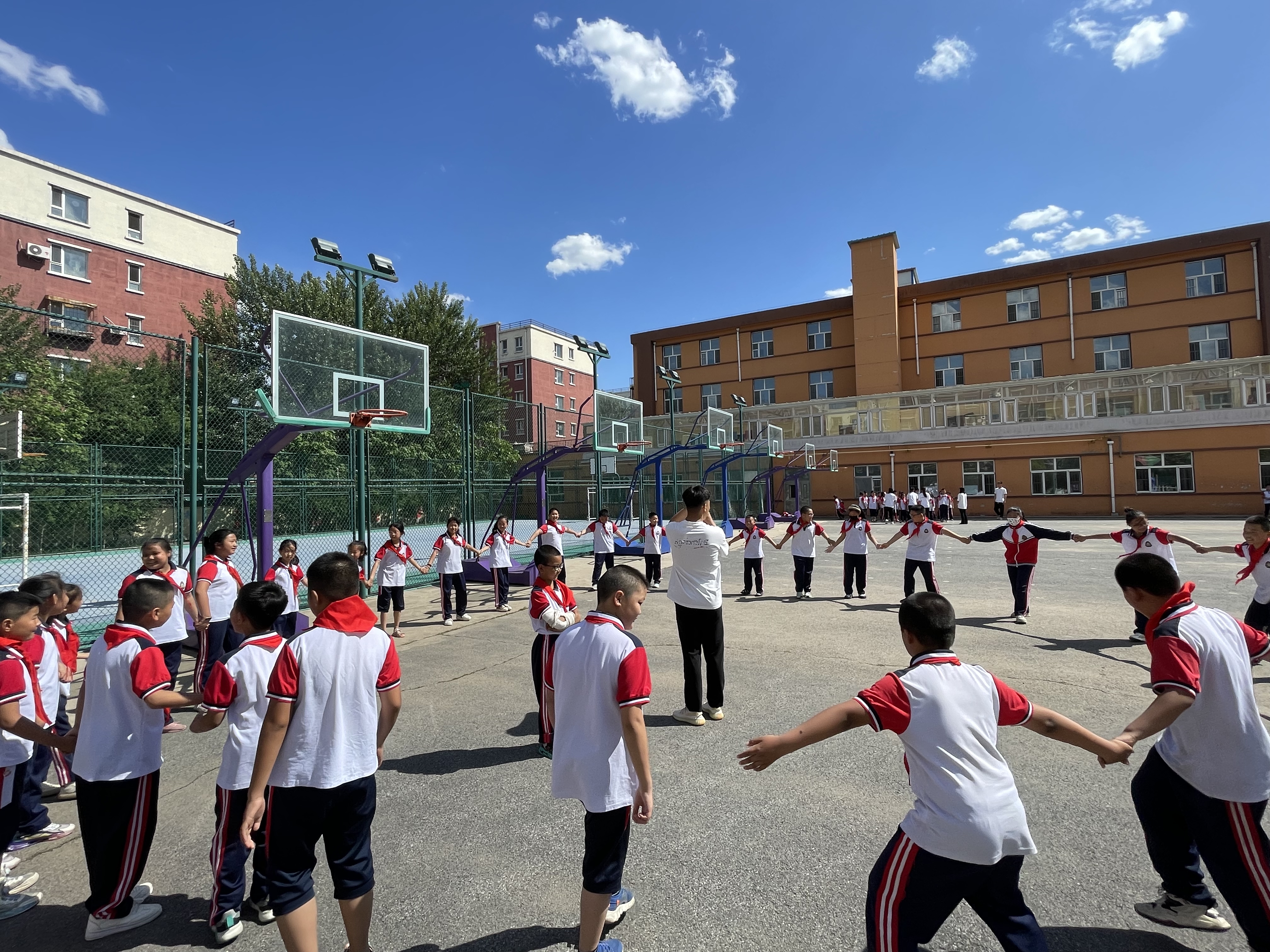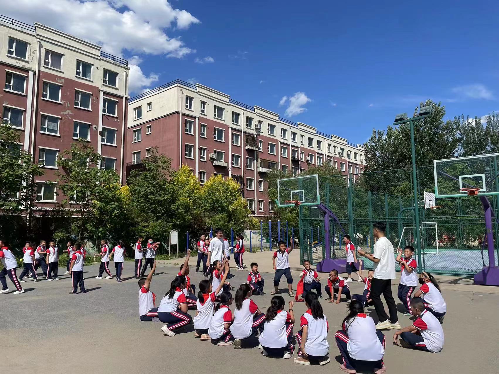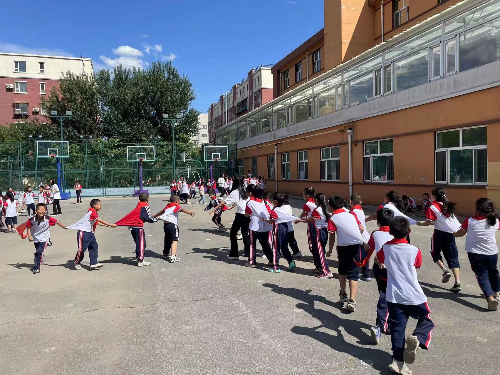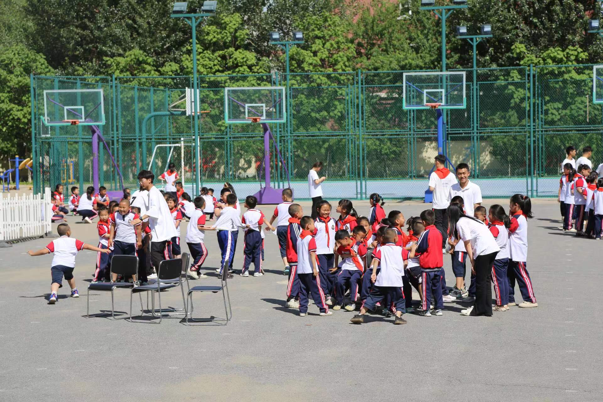 体育学院学生代表带领同学们进行游戏环节。他们根据各年段的孩子的能动差异,灵活调整,组织各种丰富而有趣的游戏:老鹰抓小鸡、抢椅子、拉网捕鱼、贪吃蛇、丢手绢……