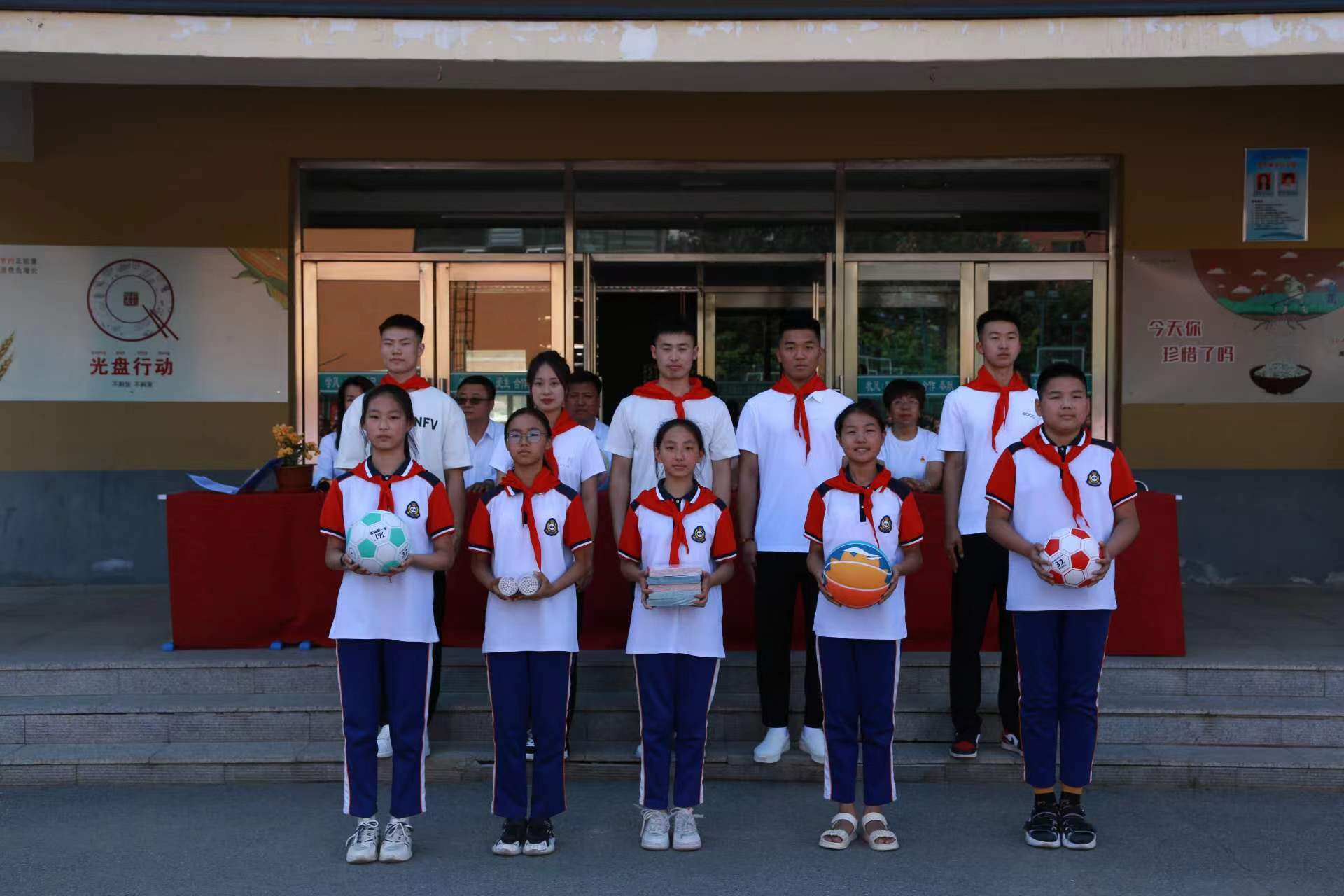 体育学院教师与学生代表向学生们捐赠体育用品及学习用品,每个用品上都附带着对孩子们的祝福语,希望他们刻苦学习,树立远大理想,做一个对国家、对社会有贡献的人。