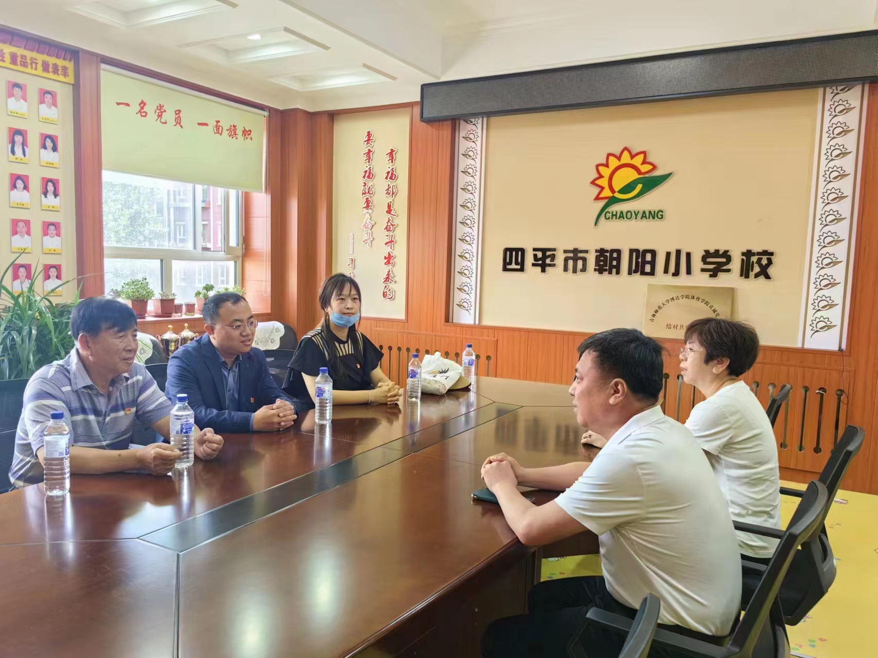 刘丹院长、杜振兴老师和王婧老师与朝阳小学的校领导在党员活动室开展了交流会,结对共建交流学习活动还在继续,此次活动加强了两校之间的沟通与交流,大家一致表示将携手共进,实现同交流、共成长、资源共享的教坛新景,共同谱写两校教育的美好明天!