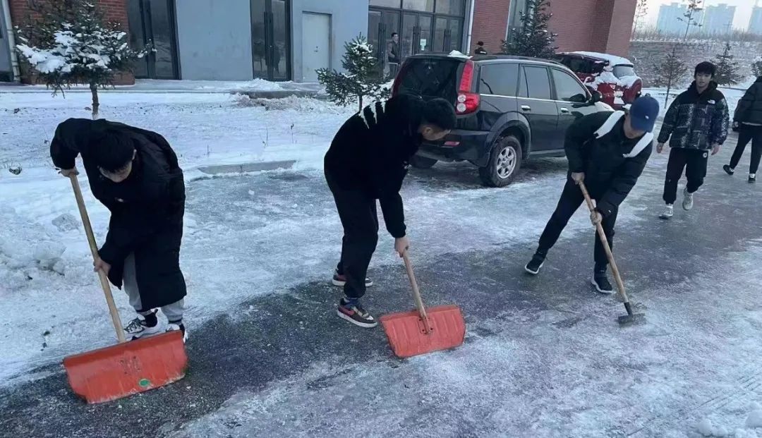 在大雪过后的寂静中,体育馆前热闹了起来,伴随着凛冽的寒风,老师带领学生戴好围巾手套、拿起除雪工具迅速行动起来,他们无畏严寒、不顾冰雪拍打在脸上,大家齐心协力,分工合作,配合默契,各种除雪工具与积雪厚冰的碰撞声响彻校园经过一个半小时不间断的清扫,体育馆前的积雪已经被清理的一干二净。