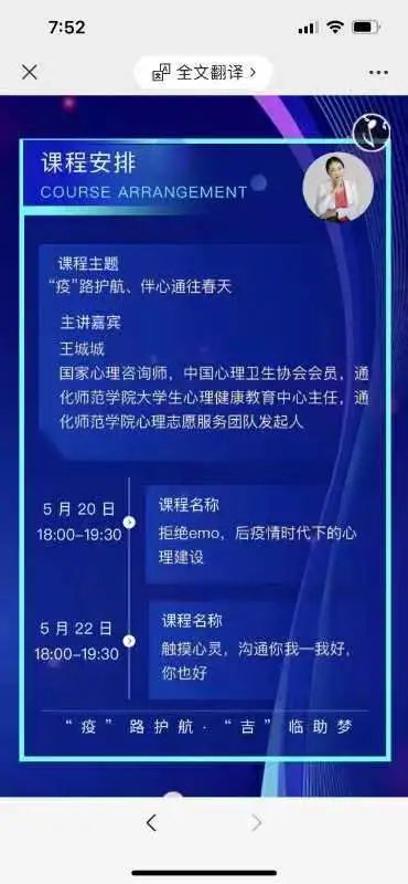 疫情爆发后,我们的生活方式也发生了彻底的改变。这些改变不仅是在生理,更是在心理。听了本次“疫路护航,吉临逐梦”,老师们讲的一些内容对我有很 大的帮助,我学到了一些关于心理调节的方法。