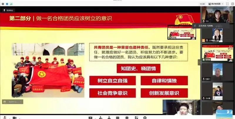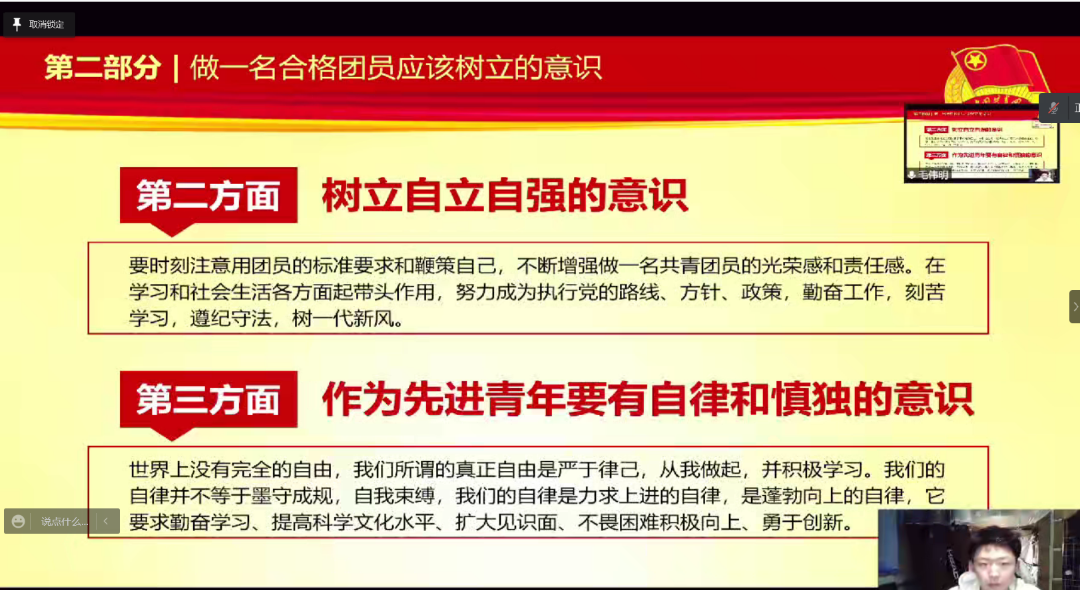 最后,由杜老师做出总结:知团史、晓团情,中国共青团已走过一百年的光辉历程,中国共青团还是一个拥有光辉历程的出色组织,作为一名光荣的团员,我们应该严于律己,不断的增强个人的团员意识,用实际行动展现当代青年的时代性与先进性,绝不能让胸前的团徽褪色。