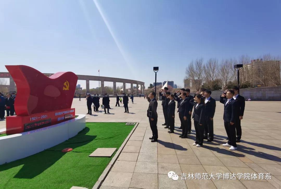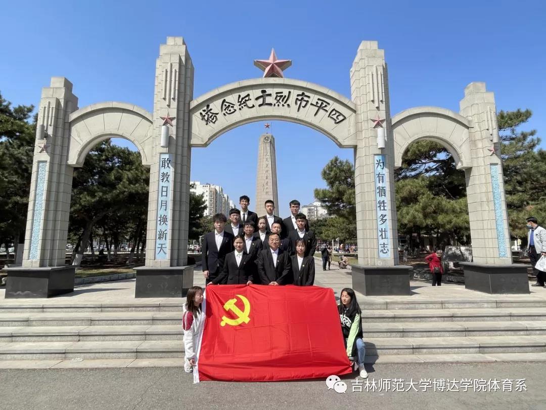 为庆祝中国共产党成立100周年,2021年4月18日体育学院在四平战役纪念馆开展“重温入党誓词,重忆入党初心”主题党日活动。参加此次活动的有体育学院党支部书记杜振兴老师,以及体育学院学生党员。参加此次活动党员身着正装,佩戴党徽,带着对党组织的赤诚之心和对先烈的缅怀之情,在党旗下庄严宣誓。
