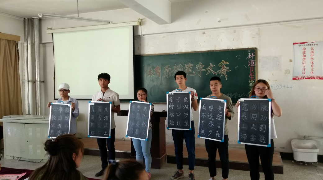 2017年5月24日下午,1417教室,一场粉笔字大赛拉开了序幕。比赛分初赛、决赛二个阶段。采用现场小黑板书写的形式进行,板书内容统一,选自中华经典诗词歌赋等文学作品