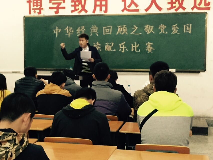 为了增强我系学生的敬党爱国之情,同时为大家提供一个锻炼自己,展现自己的平台,我系于2015年4月8日在博达学院2317教室举办了吉林师范大学博达学院体育系“中华经典回顾之敬党爱国”朗读配乐比赛。担任本次比赛的评委有分团委副书记钱烨飞、社联主席钟微、学生会副主席肖尧以及实践部部长袁炳东。