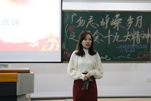 新思想引领新时代,新时代呼唤新作为。为更好的贯彻学习十九大精神,让我院学生深刻领会十九大精神的内涵,12月4日下午三点,由外国语学院分团委组织部主办的“勿忘峥嵘岁月之纪念十九大精神”主题党日活动于综合楼1214教室举行。莅临本次活动的嘉宾有16级辅导员陈政妤老师、组织部部长牛佳琪以及19级学生代表。