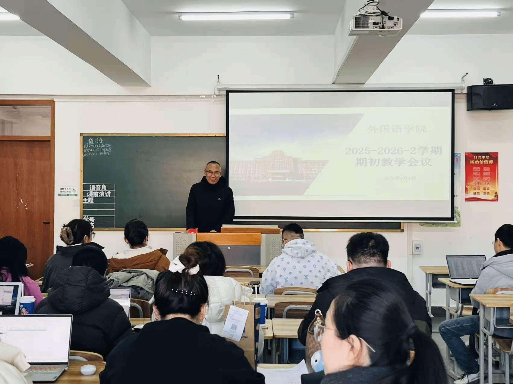 为精准统筹新学期教学工作,确保教学秩序平稳开展、教学质量稳步提升,2026年3月4日,外国语学院在综合楼1218召开 2025-2026-2 学期期初教学会议。学院全体教师参会,会议由教学院长金锦姬主持,院长矫福军就新学期重点工作作出部署。