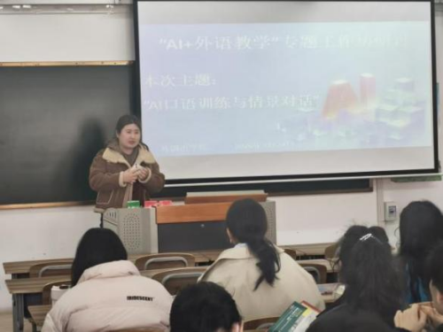 研讨会上,各语种专业教师结合一线教学实践,分享 AI 工具在外语口语教学中的应用经验、实操方法与优化建议。英语专业王雨涵老师介绍,自主开发口语小程序能够有效辅助学生开展自主口语训练;德语专业马跃老师分享了德语助手、豆包、DeepSeek 等工具的课堂应用心得,并就提升学生课堂专注度提出改进思路。