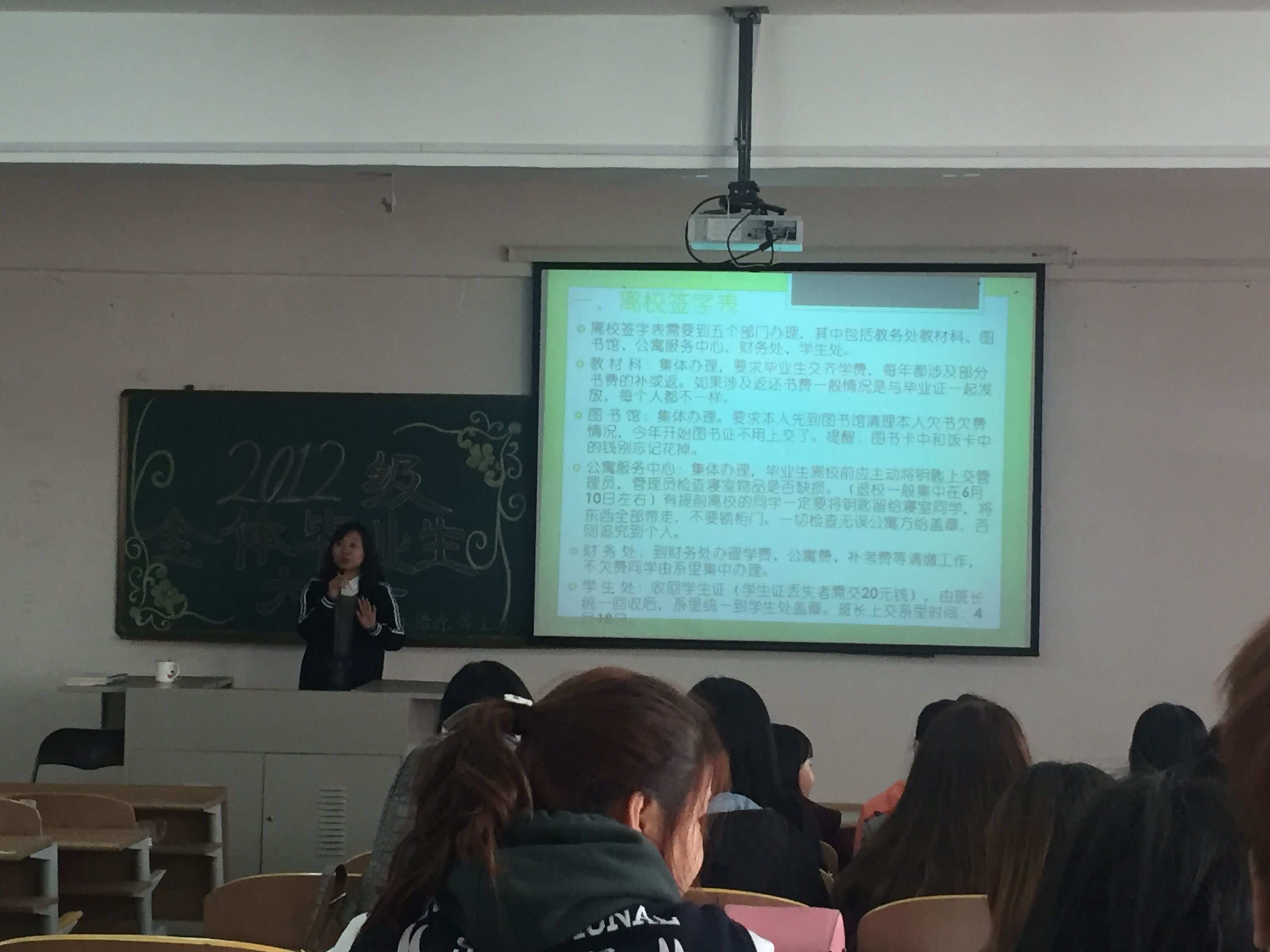会议内容包括:离校手续的办理、毕业生登记表的填写、二学历毕业生登记表回收、教师资格证的办理材料、就业协议和派遣工作的解读、档案邮寄地址的填写、户口迁移的统计、党员组织关系转递、大学期间档案要件、毕业材料领取的注意事项、困难学生求职补贴如何申请等。崔老师针对上述内容进行详细讲解和答疑。同学们认真听取并记录。