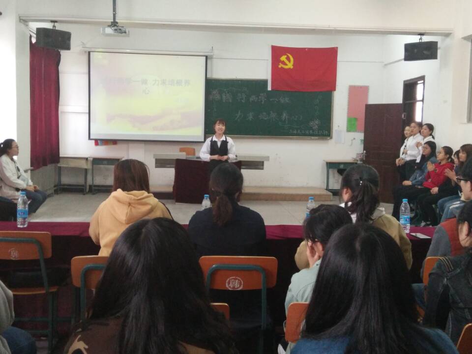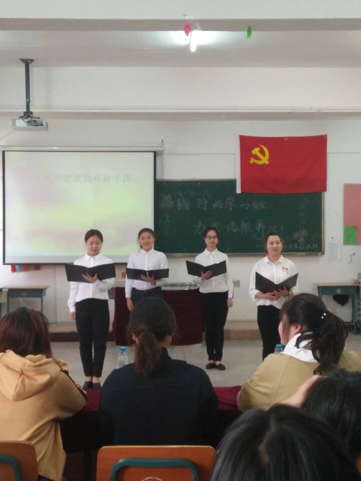 本次活动分为两个环节。第一环节同学慷慨激昂地进行了以“没有共产党就没有新中国”为题的诗朗诵,朗诵过后由两位同学演唱歌曲《没有共产党就没有新中国》。朗诵及歌曲振奋人心,令人激动不已。第二环节放映了热播电视剧“人民的名义”片段,播放过后同学们热烈发表了观后感,对国家干部贪污腐败问题进行深入探讨,发人深省。