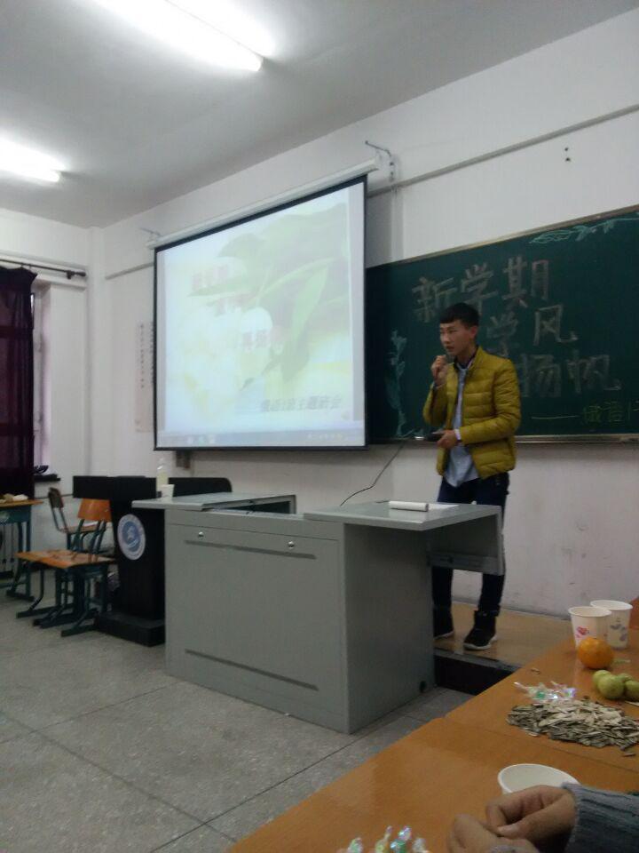班会在歌声中拉开了帷幕。首先,由俄语班班委会成员总结过去一年的工作,大家互相交流经验,缅怀过去,展望未来,特别强调学习的重要性,督促全班同学努力学习,争创良好学风班风。 其次,刘爽同学演唱了一首《南山南》、王丹和祁雪俏同学演唱了歌曲《有点甜》,美妙的歌声烘托了班会的气氛。在游戏环节中,崔婷婷老师带领大二大一同学们参加抢凳子游戏,此游戏不仅带动了全班同学活跃的气氛,也加深了老师与同学之间的友谊。接下来的《‘咖妃’后宫记》小品表演更是将班会气氛推向高潮。