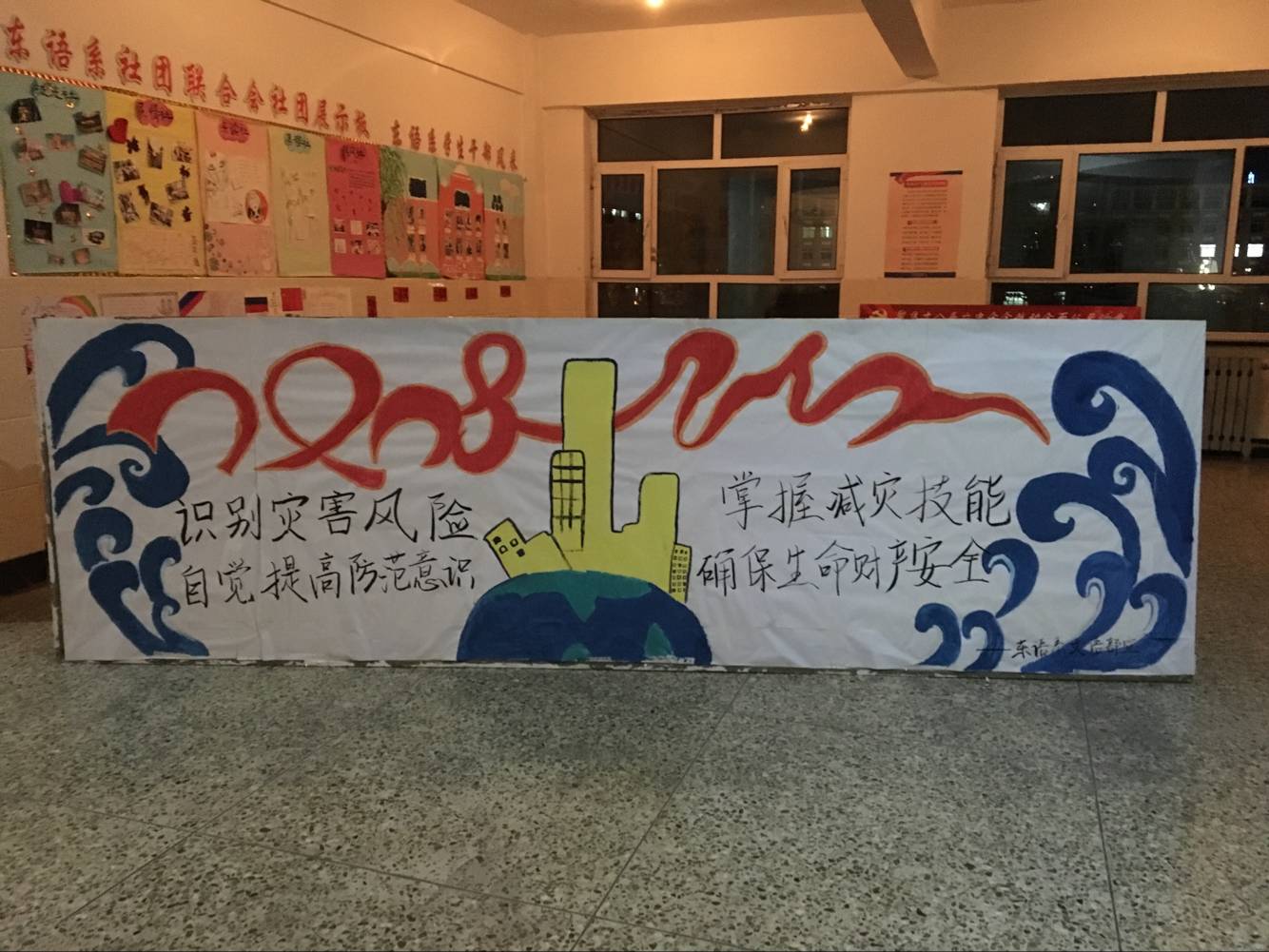 首先,5月10日在三教二楼大厅展出以“识别灾害风险,自觉提高防范意识;掌握减灾技能,确保生命财产安全”为主题的黑板报,大力宣传防灾减灾方面的法律法规和防灾减灾知识。要加强应急救援机制建设,进一步完善应急,切实增强广大师生对各类突发事件的防范意识和自我保护能力。
