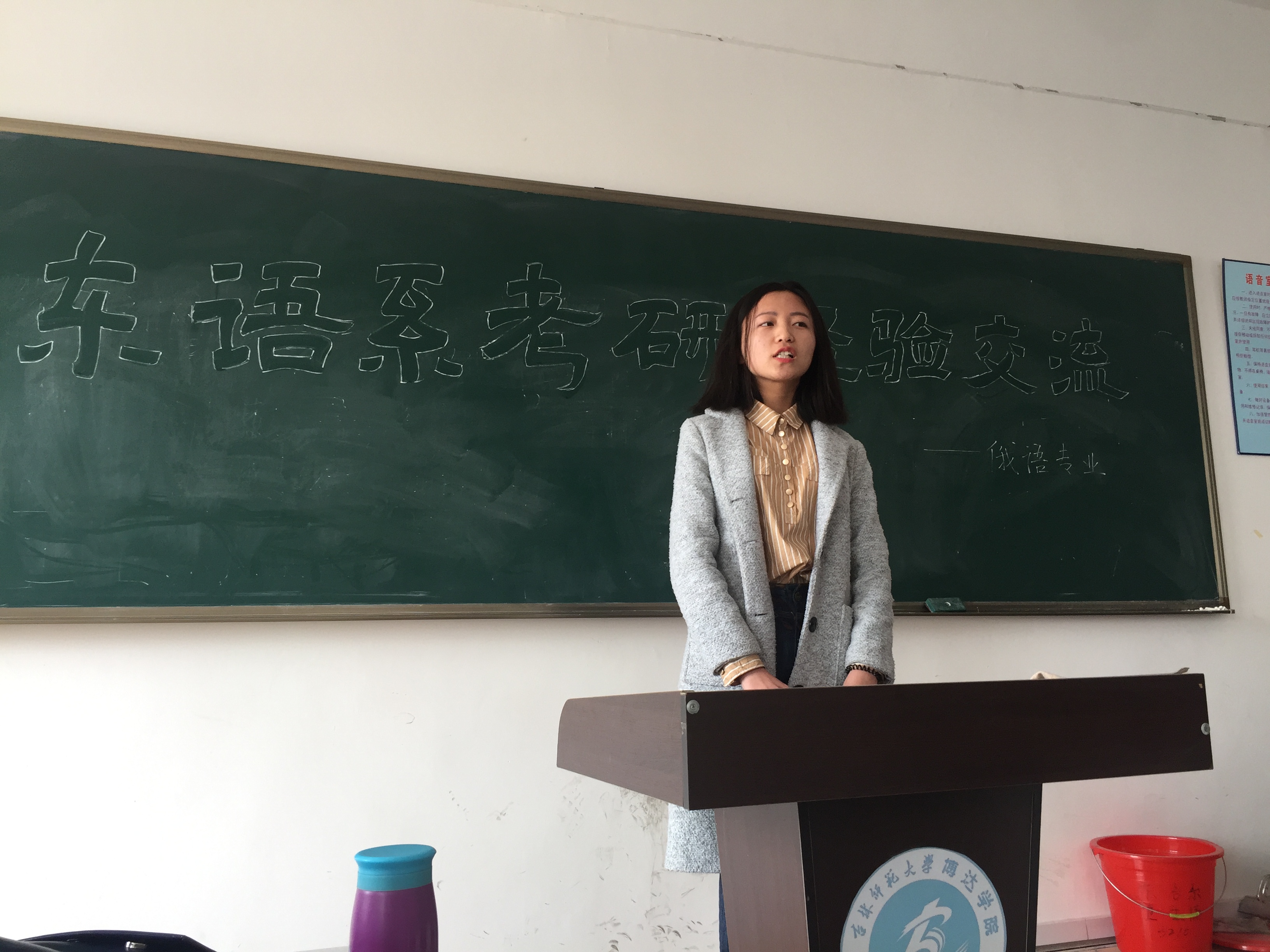 首先,东语系辅导员崔婷婷老师对13级考研学生取得的优异成绩给予了高度肯定和深深祝贺,接着深入分析了当下的考研形势,并指出此种形式对14级考研学生的有利之处,鼓励同学们积极考研,努力拼搏,奋斗不止。接着,学长学姐们就如何考研与考研时期心态的调整等方面进行细致讲解,介绍合适的复习资料,分享优质的学习方法,尽心尽力为即将考研的同学们传授宝贵经验,甚至对跨专业考研也进行了分析与指导,为同学们解决了许多困惑。他们的亲切热情赢得同学们的阵阵掌声。之后是答疑解惑环节,同们积极踊跃,争先恐后的提出心中疑问。学长学姐给在座的同学们做了现场的解答,针对在场同学的疑问给予解析并给同学们送上祝福,祝福那些想考研的同学们都能考入自己满意的院校。