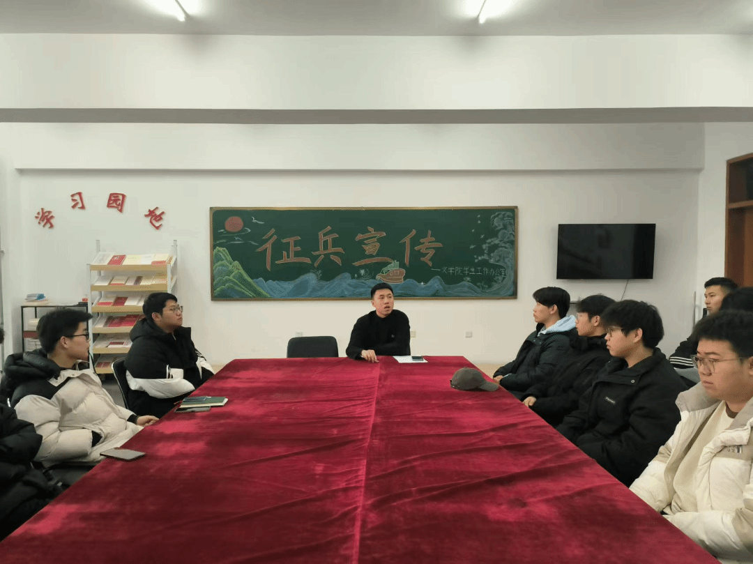 为激发同学们的爱国热情与参军积极性,帮助我院学生了解征兵政策,激发学生应征入伍的热情。文学院于2024年12月18日在综合楼1506党员活动室召开了文学院征兵动员大会,文学院22级全体男生及有志入伍的同学参与此次会议,会议由22级辅导员吴昊璁老师主持。