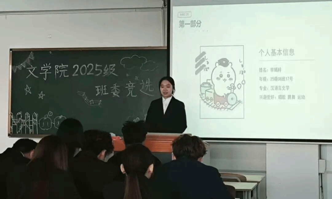 为完善班级组织架构,凝聚班级向心力,助力新生快速融入集体,吉林师范大学博达学院文学院于十月末逐步开展25级四年制本科班委竞选活动。文学院辅导员石欣玉老师、各班竞选同学及班代共同参与本次竞选活动。
