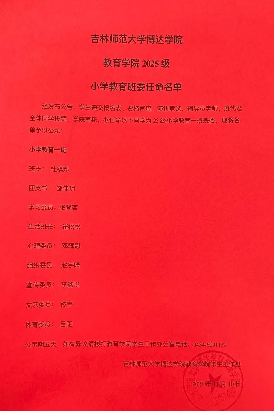 经班级民主评议、辅导员及班代的综合考量和学院的审核,现正式公布新一届班委任命名单。本次任命秉持公平、公正、公开原则,旨在选拔出责任心强、能力突出的同学,共同推动班级建设迈向新台阶。竞选结果如下:25级学前教育(专升本二年制)1班25级学前教育(专升本二年制)2班25级学前教育(专升本二年制)3班25级学前教育(专升本二年制)4班25级小学教育(专升本二年制)1班25级小学教育(专升本二年制)2班25级小学教育(专升本二年制)...