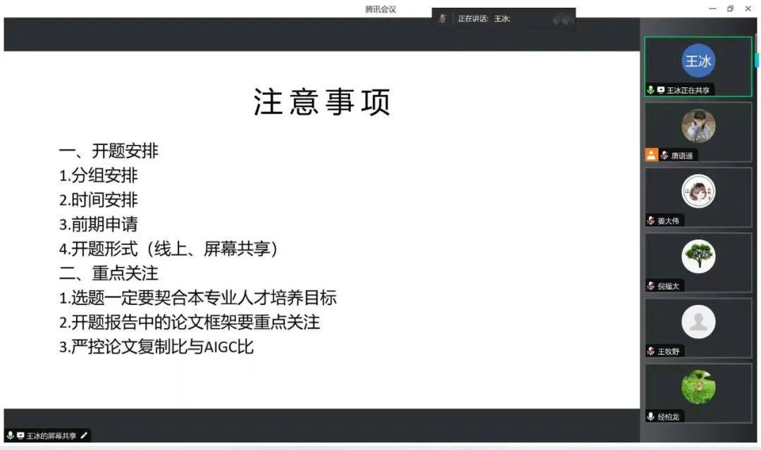 会议伊始,王冰副院长介绍了开题报告会的整体安排,并围绕开题报告的撰写要点提出指导建议,特别强调指导的及时性、选题与培养目标的契合度以及研究框架的规范性。她重点指出,当前部分学生开题报告中存在AI生成内容复制比过高的问题,提示指导教师要严控论文的复制比与AIGC比例,确保学术规范。