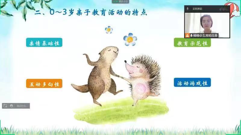 本次会议围绕早教活动的方案的设计要为题,张久楠老师和李楠老师根据学生不会设计教案,教案设计不合理而展开。本次会议分为三个部分:第一部分主持人讲解早期教育亲子活动设计的基本要求:内容选择生活化、主体参与多边化、形式互动游戏化、活动环节完整化、个体差异兼顾化、时间空间延续化。第二部分详细早期教育亲子活动的组织与实施-走线活动的活动流程:一、徒手走线二、托物走线三、模仿走线四、音乐游戏导入。第三部分详细介绍了早教活动的各个环节: 1.问好活动(自然问好,节奏问好,唱名问好,游戏问好)2.语言活动3.认知活动4.艺术活动(音乐活动、美术活动)5.动作发展活动(粗大动作活动、精细动作活动)6.再见活动。