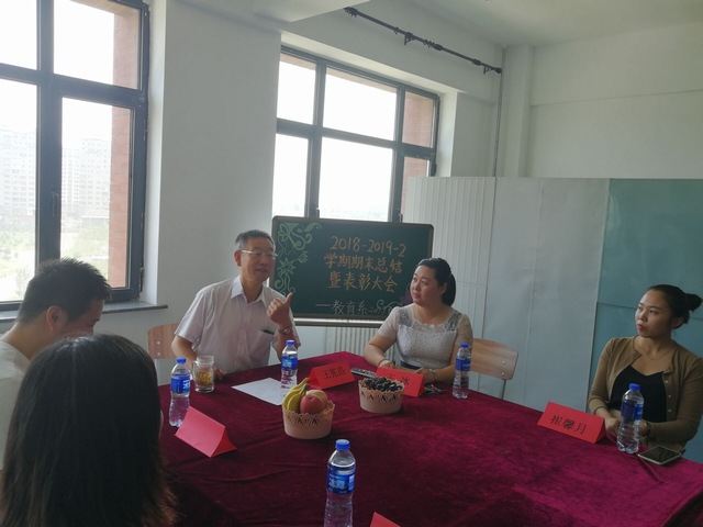 2019年7月7日14:00,教育系在综合楼1321教室召开学期期末总结暨表彰大会,参加本次会议的人员有教育系主任王宪昌、副主任王冰、学工办主任柳志明、辅导员崔馨月、辅导员李扬、教学秘书及教育系全体专职教师。王宪昌主任主持会议并做了重要讲话。