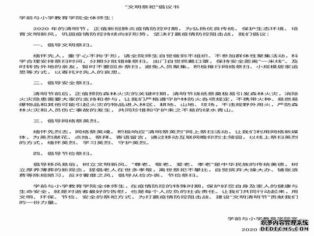 首先,学院结合疫情特点,制定了清明节活动开展方案,通过微信群、QQ群向全院师生发出清明节文明祭祀倡议书,倡导全校学生做到文明祭祀、绿色祭祀、节俭祭祀、安全祭祀、错峰祭祀。其次,今年是中华人民抗日战争暨世界反法西斯战争胜利75周年,是全国人民上下众志成城防控新冠肺炎疫情的关键时期。为了深入开展革命传统教育和爱国主义教育,哀悼为抗击疫情斗争牺牲的烈士和逝世同胞。学前与小学教育学院向全校学生发起“致敬·2020清明祭英烈”活动。通过默哀悼念、主题书法展、自主观看红色电影等方式来了解英雄事迹,表达哀思与敬意,缅怀先辈。最后,学前与小学教育学院新闻部对同学们进行线上采访,询问关于倡导绿色清明祭祀方式的观点。结果显示,同学们更偏向以鲜花祭祀、植树祭祀、网上祭祀等方式取代传统的上坟烧纸祭祀方式,表示会以实际行动支持文明祭祀。